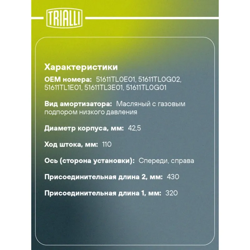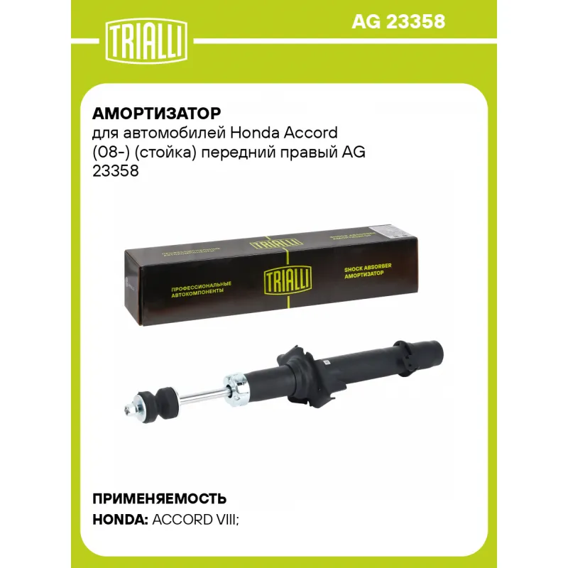 Амортизатор для автомобилей Honda Accord (08-) (стойка) передний правый Описание: Амортизатор AG 23358 бренда TRIALLI – это устройство для гашения колебаний (демпфирования) и поглощения толчков и ударов, действующих на раму. Особенности AG 23358: - Вид – Масляный с газовым подпором низкого давления; - Тип – Двухтрубный, гидравлический; Для крепления к деталям кузова или подвески используются крепления: верхнее Шток M10x1,25; и нижнее Зажим. Амортизатор в машину (стойка) имеет специальную площадку для установки пружины подвески. Совместим с: HONDA ACCORD.Подбор по VIN-номеру вашего автомобиля - через кнопку 'Задать вопрос'. Специалист проверит применяемость и ответит вам. Преимущества: - Инновационная технология производства; - Контроль качества каждой позиции по чертежам и с помощью 3D модели; - Сальник NOK; - Высокоэффективная система проектирования; - Гарантия до двух лет или 60 000 км пробега; Амортизаторы автомобильные существенно влияют на комфорт вождения, сокращая вибрации от неровностей дороги, что делает поездку более плавной и приятной. Регулярное и своевременное обслуживание амортизаторов помогут продлить их срок службы и обеспечить надёжную работу. Характеристики: Артикул: AG 23358 OEM номера: 51611TL0E01, 51611TL0G02, 51611TL1E01, 51611TL3E01, 51611TL0G01 Товарная линейка: BLACK Парный товар: AG 23157 Количество на автомобиль: 1 Вид амортизатора: Масляный с газовым подпором низкого давления Тип верхнего крепления: Шток Тип нижнего крепления: Зажим Диаметр корпуса, мм: 42.5 Диаметр штока, мм: 12.5 Ход штока, мм: 110 Размер резьбы штока: M10x1,25 Тип амортизатора: Двухтрубный, гидравлический Ось (сторона установки): Спереди, справа Дополнительная информация: Упаковка изделия может отличаться от представленной на фото Присоединительная длина 2, мм: 430 Присоединительная длина 1, мм: 320 Сопутствующий товар: Амортизаторы: AG 23157, AG 23505 Гарантийный срок: 2 года/60 000 км Комплектация: Амортизатор (стойка) передний - 1 шт Гайка крепежная - 1 шт Подушка резиновая - 1 шт Гарантия: от 1 года.