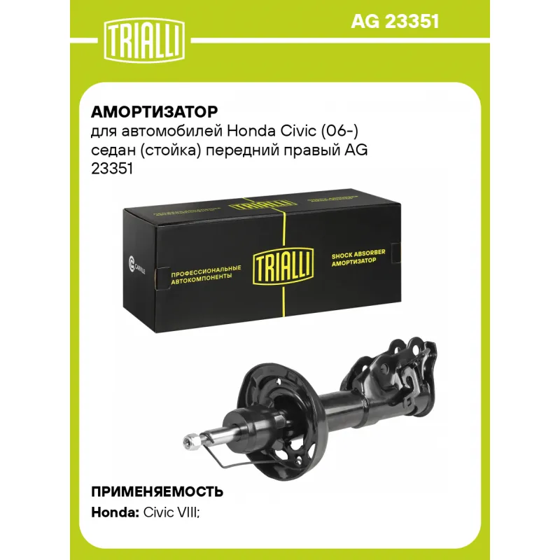 Амортизатор для автомобилей Honda Civic (06-) седан (стойка) передний правый Описание: Амортизатор AG 23351 бренда TRIALLI – это устройство для гашения колебаний (демпфирования) и поглощения толчков и ударов, действующих на раму. Особенности AG 23351: - Вид – Масляный с газовым подпором низкого давления; - Тип – Двухтрубный, гидравлический; Для крепления к деталям кузова или подвески используются крепления: верхнее Шток M12x1.25; и нижнее Скоба. Амортизатор в машину (стойка) имеет специальную площадку для установки пружины подвески. Совместим с: HONDA CIVIC.Подбор по VIN-номеру вашего автомобиля - через кнопку 'Задать вопрос'. Специалист проверит применяемость и ответит вам. Преимущества: - Инновационная технология производства; - Контроль качества каждой позиции по чертежам и с помощью 3D модели; - Сальник NOK; - Высокоэффективная система проектирования; - Гарантия до двух лет или 60 000 км пробега; Амортизаторы автомобильные существенно влияют на комфорт вождения, сокращая вибрации от неровностей дороги, что делает поездку более плавной и приятной. Регулярное и своевременное обслуживание амортизаторов помогут продлить их срок службы и обеспечить надёжную работу. Характеристики: Артикул: AG 23351 OEM номера: 51605SNBE04, 51605SNCE02 Товарная линейка: BLACK Парный товар: AG 23150 Количество на автомобиль: 1 Вид амортизатора: Масляный с газовым подпором низкого давления Тип верхнего крепления: Шток Тип нижнего крепления: Скоба Диаметр корпуса, мм: 50 Диаметр штока, мм: 22 Ход штока, мм: 187 Размер резьбы штока: M12x1.25 Тип амортизатора: Двухтрубный, гидравлический Ось (сторона установки): Спереди, справа Дополнительная информация: Упаковка изделия может отличаться от представленной на фото Присоединительная длина 2, мм: 510±3 Присоединительная длина 1, мм: 323±3 Сопутствующий товар: Амортизаторы: AG 23150, AG 23501 Гарантийный срок: 2 года/60 000 км Подходит для авто: Honda Civic VIII (06-) Для проверки применяемости отправьте VIN автомобиля через вкладку "Есть вопросы о товаре?" Комплектация: Амортизатор (стойка) передний - 1 шт Гайка крепежная - 1 шт Гарантия: от 1 года.