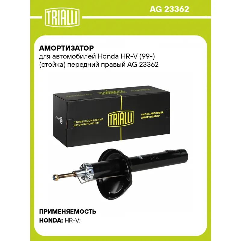 Амортизатор для автомобилей Honda HR-V (99-) (стойка) передний правый Описание: Амортизатор AG 23362 бренда TRIALLI – это устройство для гашения колебаний (демпфирования) и поглощения толчков и ударов, действующих на раму. Особенности AG 23362: - Вид – Масляный с газовым подпором низкого давления; - Тип – Двухтрубный, гидравлический; Для крепления к деталям кузова или подвески используются крепления: верхнее Шток M12x1.25; и нижнее Скоба. Амортизатор в машину (стойка) имеет специальную площадку для установки пружины подвески. Совместим с: HONDA HR-V.Подбор по VIN-номеру вашего автомобиля - через кнопку 'Задать вопрос'. Специалист проверит применяемость и ответит вам. Преимущества: - Инновационная технология производства; - Контроль качества каждой позиции по чертежам и с помощью 3D модели; - Сальник NOK; - Высокоэффективная система проектирования; - Гарантия до двух лет или 60 000 км пробега; Амортизаторы автомобильные существенно влияют на комфорт вождения, сокращая вибрации от неровностей дороги, что делает поездку более плавной и приятной. Регулярное и своевременное обслуживание амортизаторов помогут продлить их срок службы и обеспечить надёжную работу. Характеристики: Артикул: AG 23362 OEM номера: 51605S2H014, 51605S2H034, 51605S2HG02, 51605S2HG03, 51605S2HG51 Товарная линейка: BLACK Парный товар: AG 23161 Количество на автомобиль: 1 Вид амортизатора: Масляный с газовым подпором низкого давления Тип верхнего крепления: Шток Тип нижнего крепления: Скоба Диаметр корпуса, мм: 51 Диаметр штока, мм: 22 Ход штока, мм: 178 Размер резьбы штока: M12x1.25 Тип амортизатора: Двухтрубный, гидравлический Ось (сторона установки): Спереди, справа Дополнительная информация: Упаковка изделия может отличаться от представленной на фото Присоединительная длина 2, мм: 569 Присоединительная длина 1, мм: 391 Сопутствующий товар: Амортизаторы: AG 23161, AG 23508 Гарантийный срок: 2 года/60 000 км Комплектация: Амортизатор (стойка) передний - 1 шт Гайка крепежная - 1 шт Гарантия: от 1 года.