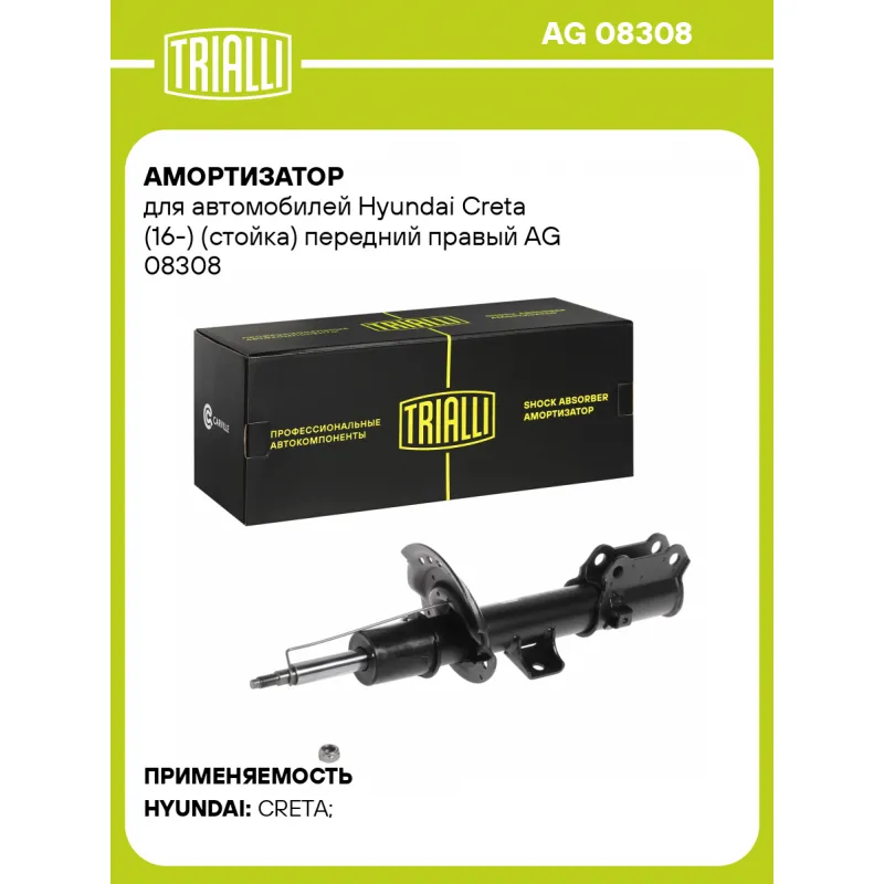 Амортизатор для автомобилей Hyundai Creta (16-) (стойка) передний правый Описание: Амортизатор AG 08308 бренда TRIALLI – это устройство для гашения колебаний (демпфирования) и поглощения толчков и ударов, действующих на раму. Особенности AG 08308: - Вид – Масляный с газовым подпором низкого давления; - Тип – Двухтрубный, гидравлический; Для крепления к деталям кузова или подвески используются крепления: верхнее Шток M12x1,25; и нижнее Скоба. Амортизатор в машину (стойка) имеет специальную площадку для установки пружины подвески. Совместим с: HYUNDAI CRETA.Подбор по VIN-номеру вашего автомобиля - через кнопку 'Задать вопрос'. Специалист проверит применяемость и ответит вам. Преимущества: - Инновационная технология производства; - Контроль качества каждой позиции по чертежам и с помощью 3D модели; - Сальник NOK; - Высокоэффективная система проектирования; - Гарантия до двух лет или 60 000 км пробега; Амортизаторы автомобильные существенно влияют на комфорт вождения, сокращая вибрации от неровностей дороги, что делает поездку более плавной и приятной. Регулярное и своевременное обслуживание амортизаторов помогут продлить их срок службы и обеспечить надёжную работу. Характеристики: Артикул: AG 08308 OEM номера: 54661-M0100, 54661-M0000, 54661-M0200, 54661-M4000, 54661-M4200, 54661-M4500 Товарная линейка: BLACK Парный товар: AG 08107 Количество на автомобиль: 1 Вид амортизатора: Масляный с газовым подпором низкого давления Тип верхнего крепления: Шток Тип нижнего крепления: Скоба Диаметр корпуса, мм: 51 Диаметр штока, мм: 22 Ход штока, мм: 132 Размер резьбы штока: M12x1,25 Тип амортизатора: Двухтрубный, гидравлический Ось (сторона установки): Спереди, справа Присоединительная длина 2, мм: 524 Сопутствующий товар: Опоры передних стоек: SA 0870 Присоединительная длина 1, мм: 392 Сопутствующий товар: Ремонтные комплекты амортизаторов: BC 1948, BCS 2048 Сопутствующий товар: Амортизаторы: AG 08107, AG 08540, AG 08560 Гарантийный срок: 2 года/60 000 км Комплектация: Гайка крепежная - 1 шт Амортизатор (стойка) передний - 1 шт Гарантия: от 1 года.