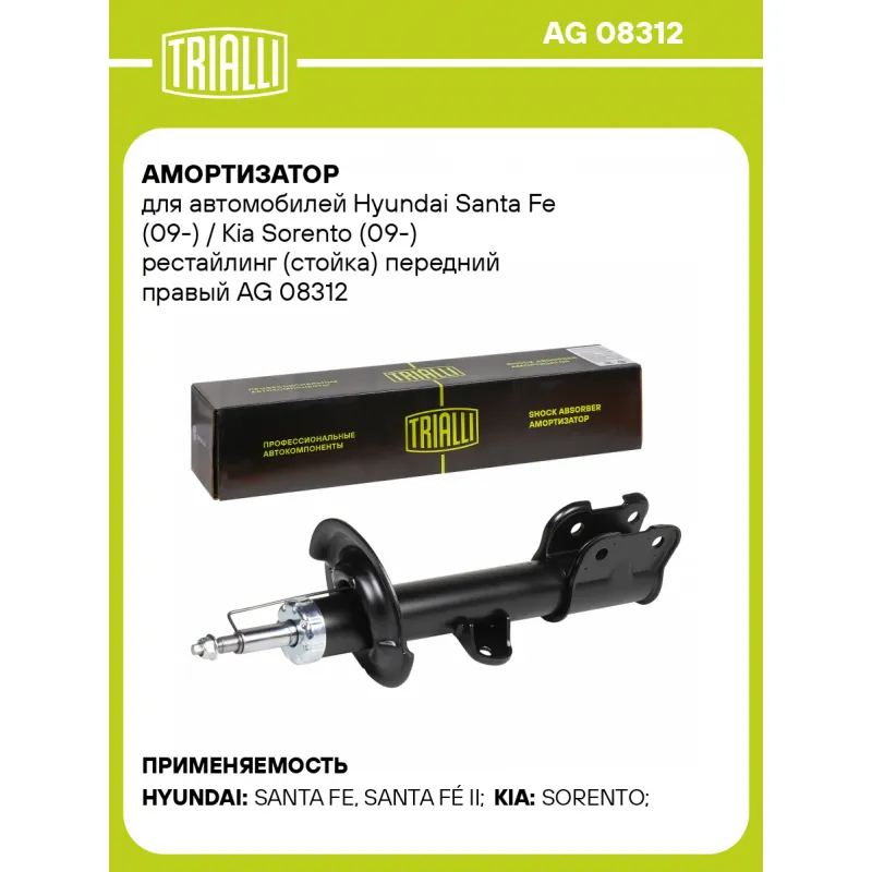 Амортизатор для автомобилей Hyundai Santa Fe (09-) / Kia Sorento (09-) рестайлинг (стойка) передний правый Описание: Амортизатор AG 08312 бренда TRIALLI – это устройство для гашения колебаний (демпфирования) и поглощения толчков и ударов, действующих на раму. Особенности AG 08312: - Вид – Масляный с газовым подпором низкого давления; - Тип – Двухтрубный, гидравлический; Для крепления к деталям кузова или подвески используются крепления: верхнее Шток M12x1.25; и нижнее Скоба. Амортизатор в машину (стойка) имеет специальную площадку для установки пружины подвески. Совместим с: HYUNDAI SANTA FE, KIA SORENTO.Подбор по VIN-номеру вашего автомобиля - через кнопку 'Задать вопрос'. Специалист проверит применяемость и ответит вам. Преимущества: - Инновационная технология производства; - Контроль качества каждой позиции по чертежам и с помощью 3D модели; - Сальник NOK; - Высокоэффективная система проектирования; - Гарантия до двух лет или 60 000 км пробега; Амортизаторы автомобильные существенно влияют на комфорт вождения, сокращая вибрации от неровностей дороги, что делает поездку более плавной и приятной. Регулярное и своевременное обслуживание амортизаторов помогут продлить их срок службы и обеспечить надёжную работу. Характеристики: Артикул: AG 08312 OEM номера: 54660-2B510 Товарная линейка: BLACK Парный товар: AG 08111 Количество на автомобиль: 1 Вид амортизатора: Масляный с газовым подпором низкого давления Тип верхнего крепления: Шток Тип нижнего крепления: Скоба Диаметр корпуса, мм: 54 Диаметр штока, мм: 22 Ход штока, мм: 201 Размер резьбы штока: M12x1.25 Тип амортизатора: Двухтрубный, гидравлический Ось (сторона установки): Спереди, справа Дополнительная информация: Упаковка изделия может отличаться от представленной на фото Присоединительная длина 2, мм: 601 Присоединительная длина 1, мм: 400 Сопутствующий товар: Амортизаторы: AG 08111 Гарантийный срок: 2 года/60 000 км Комплектация: Амортизатор передний - 1 шт Гайка крепежная - 1 шт Гарантия: от 1 года.