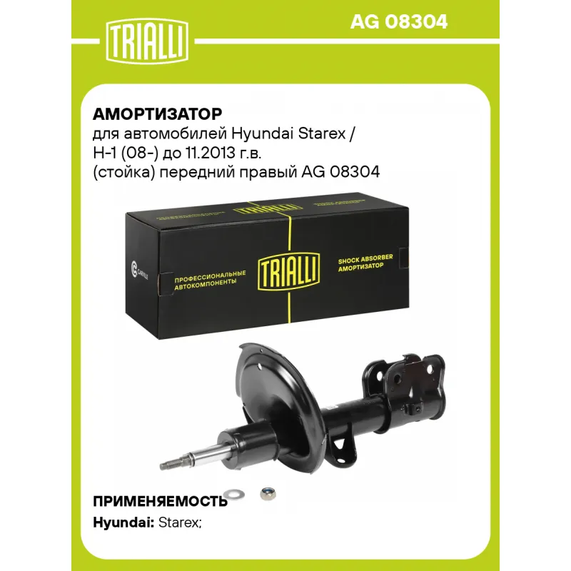 Амортизатор для автомобилей Hyundai Starex / H-1 (08-) до 11.2013 г.в. (стойка) передний правый Описание: Амортизатор AG 08304 бренда TRIALLI – это устройство для гашения колебаний (демпфирования) и поглощения толчков и ударов, действующих на раму. Особенности AG 08304: - Вид – Масляный с газовым подпором низкого давления; - Тип – Двухтрубный, гидравлический; Для крепления к деталям кузова или подвески используются крепления: верхнее Шток M12x1.25; и нижнее Скоба. Амортизатор в машину (стойка) имеет специальную площадку для установки пружины подвески. Совместим с: HYUNDAI STAREX, H-1.Подбор по VIN-номеру вашего автомобиля - через кнопку 'Задать вопрос'. Специалист проверит применяемость и ответит вам. Преимущества: - Инновационная технология производства; - Контроль качества каждой позиции по чертежам и с помощью 3D модели; - Сальник NOK; - Высокоэффективная система проектирования; - Гарантия до двух лет или 60 000 км пробега; Амортизаторы автомобильные существенно влияют на комфорт вождения, сокращая вибрации от неровностей дороги, что делает поездку более плавной и приятной. Регулярное и своевременное обслуживание амортизаторов помогут продлить их срок службы и обеспечить надёжную работу. Характеристики: Артикул: AG 08304 OEM номера: 54660-4H000, 54660-4H050, 54660-4H100, 54660-4H150, 54660-4H600, 54660-4H650 Товарная линейка: BLACK Парный товар: AG 08103 Количество на автомобиль: 1 Вид амортизатора: Масляный с газовым подпором низкого давления Тип верхнего крепления: Шток Тип нижнего крепления: Скоба Диаметр корпуса, мм: 54 Диаметр штока, мм: 22 Ход штока, мм: 179 Размер резьбы штока: M12x1.25 Тип амортизатора: Двухтрубный, гидравлический Ось (сторона установки): Спереди, справа Дополнительная информация: Для а/м до 11.2013 г.в. Присоединительная длина 2, мм: 559 Присоединительная длина 1, мм: 380 Сопутствующий товар: Ремонтные комплекты амортизаторов: BC 1966, BCS 2066 Сопутствующий товар: Амортизаторы: AG 08103,AG 08527, AG 08526, AG 08025, AG 08537 Гарантийный срок: 2 года/60 000 км Подходит для авто: Hyundai Starex (H-1) (07-) Для проверки применяемости отправьте VIN автомобиля через вкладку "Есть вопросы о товаре?" Комплектация: Амортизатор (стойка) передний - 1 шт Гайка крепежная - 1 шт Гарантия: от 1 года.