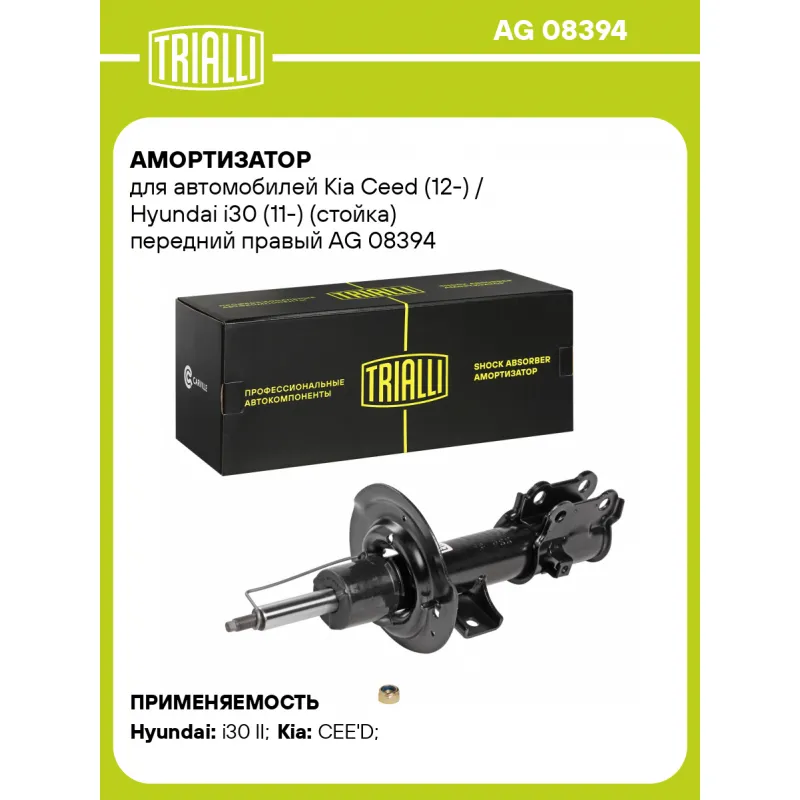Амортизатор для автомобилей Kia Ceed (12-) / Hyundai i30 (11-) (стойка) передний правый Описание: Амортизатор AG 08394 бренда TRIALLI – это устройство для гашения колебаний (демпфирования) и поглощения толчков и ударов, действующих на раму. Особенности AG 08394: - Вид – Масляный с газовым подпором низкого давления; - Тип – Двухтрубный, гидравлический; Для крепления к деталям кузова или подвески используются крепления: верхнее Шток M12x1.25; и нижнее Скоба. Амортизатор в машину (стойка) имеет специальную площадку для установки пружины подвески. Совместим с: HYUNDAI i30, KIA CEED.Подбор по VIN-номеру вашего автомобиля - через кнопку 'Задать вопрос'. Специалист проверит применяемость и ответит вам. Преимущества: - Инновационная технология производства; - Контроль качества каждой позиции по чертежам и с помощью 3D модели; - Сальник NOK; - Высокоэффективная система проектирования; - Гарантия до двух лет или 60 000 км пробега; Амортизаторы автомобильные существенно влияют на комфорт вождения, сокращая вибрации от неровностей дороги, что делает поездку более плавной и приятной. Регулярное и своевременное обслуживание амортизаторов помогут продлить их срок службы и обеспечить надёжную работу. Характеристики: Артикул: AG 08394 OEM номера: 54661A2050, 54661A2100, 54661A2150, 54661A6000, 54661A6060, 54661A6115, 54661A6160, 54661A6010, 54661A6050, 54661A6105, 54661A6150, 54661A6200, 54661A6800, 54661A6840, 54661A2000, 54661A2300, 54661A2500, 54661A2550, 54661A2600, 54661A6610, 54661A6560, 54661A6660, 54661A6100, 54661A6850, 54661A6810, 54661A6600, 54661A6710, 54661A6830, 54661A6870, 54661A6890 Товарная линейка: BLACK Парный товар: AG 08193 Количество на автомобиль: 1 Вид амортизатора: Масляный с газовым подпором низкого давления Тип верхнего крепления: Шток Тип нижнего крепления: Скоба Диаметр корпуса, мм: 51 Диаметр штока, мм: 22 Ход штока, мм: 166 Размер резьбы штока: M12x1.25 Тип амортизатора: Двухтрубный, гидравлический Ось (сторона установки): Спереди, справа Дополнительная информация: Упаковка изделия может отличаться от представленной на фото Присоединительная длина 2, мм: 500 Присоединительная длина 1, мм: 334 Сопутствующий товар: Ремонтные комплекты амортизаторов: BC 1948, BCS 2048,BC 0852 Сопутствующий товар: Амортизаторы: AG 08193, AG 08504 Гарантийный срок: 2 года/60 000 км Подходит для авто: Hyundai i30 II (11-) Kia CEE'D (12-) Для проверки применяемости отправьте VIN автомобиля через вкладку "Есть вопросы о товаре?" Комплектация: Амортизатор (стойка) передний - 1 шт Гайка крепежная - 1 шт Гарантия: от 1 года.