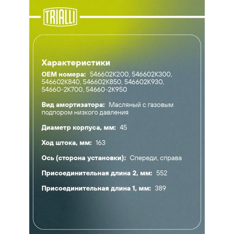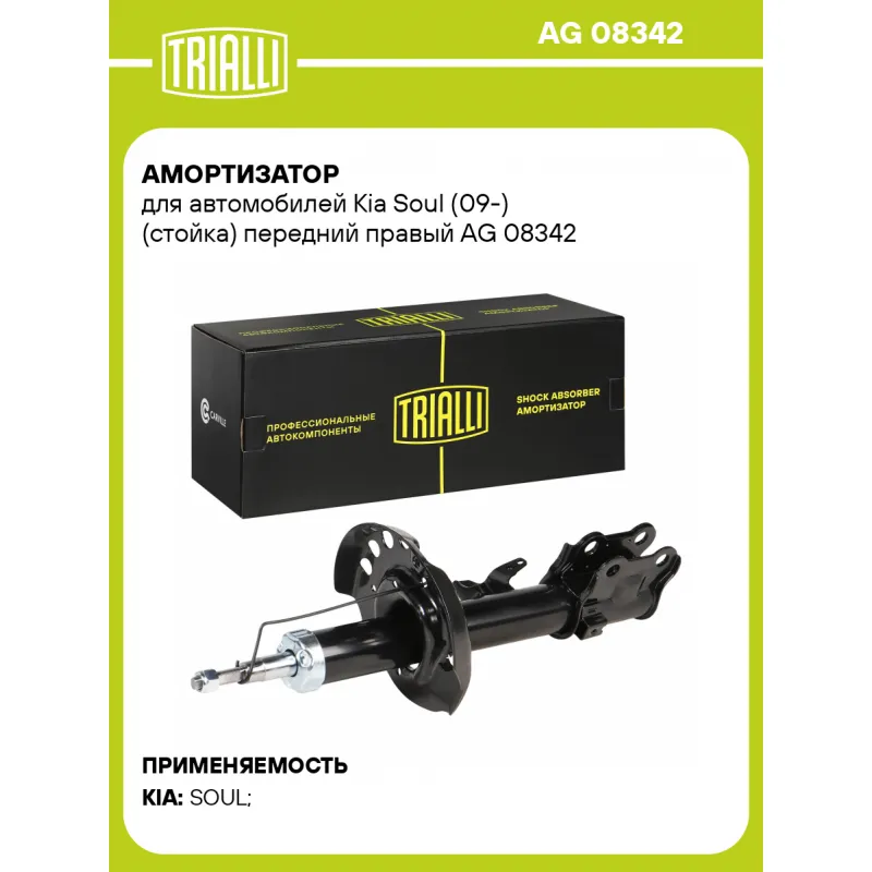 Амортизатор для автомобилей Kia Soul (09-) (стойка) передний правый Описание: Амортизатор AG 08342 бренда TRIALLI – это устройство для гашения колебаний (демпфирования) и поглощения толчков и ударов, действующих на раму. Особенности AG 08342: - Вид – Масляный с газовым подпором низкого давления; - Тип – Двухтрубный, гидравлический; Для крепления к деталям кузова или подвески используются крепления: верхнее Шток M12x1,25; и нижнее Скоба. Амортизатор в машину (стойка) имеет специальную площадку для установки пружины подвески. Совместим с: KIA SOUL.Подбор по VIN-номеру вашего автомобиля - через кнопку 'Задать вопрос'. Специалист проверит применяемость и ответит вам. Преимущества: - Инновационная технология производства; - Контроль качества каждой позиции по чертежам и с помощью 3D модели; - Сальник NOK; - Высокоэффективная система проектирования; - Гарантия до двух лет или 60 000 км пробега; Амортизаторы автомобильные существенно влияют на комфорт вождения, сокращая вибрации от неровностей дороги, что делает поездку более плавной и приятной. Регулярное и своевременное обслуживание амортизаторов помогут продлить их срок службы и обеспечить надёжную работу. Характеристики: Артикул: AG 08342 OEM номера: 546602K200, 546602K300, 546602K840, 546602K850, 546602K930, 54660-2K700, 54660-2K950 Товарная линейка: BLACK Парный товар: AG 08141 Количество на автомобиль: 1 Вид амортизатора: Масляный с газовым подпором низкого давления Тип верхнего крепления: Шток Тип нижнего крепления: Скоба Диаметр корпуса, мм: 45 Диаметр штока, мм: 20 Ход штока, мм: 163 Размер резьбы штока: M12x1,25 Тип амортизатора: Двухтрубный, гидравлический Ось (сторона установки): Спереди, справа Дополнительная информация: Упаковка изделия может отличаться от представленной на фото Присоединительная длина 2, мм: 552 Присоединительная длина 1, мм: 389 Сопутствующий товар: Ремонтные комплекты амортизаторов: BCS 2048 Сопутствующий товар: Амортизаторы: AG 08141 Гарантийный срок: 2 года/60 000 км Комплектация: Амортизатор (стойка) передний - 1 шт Гайка крепежная - 1 шт Гарантия: от 1 года.