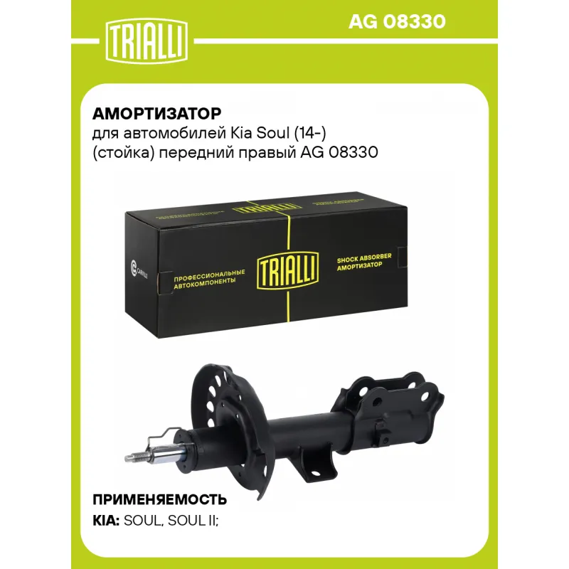 Амортизатор для автомобилей Kia Soul (14-) (стойка) передний правый Описание: Амортизатор AG 08330 бренда TRIALLI – это устройство для гашения колебаний (демпфирования) и поглощения толчков и ударов, действующих на раму. Особенности AG 08330: - Вид – Масляный с газовым подпором низкого давления; - Тип – Двухтрубный, гидравлический; Для крепления к деталям кузова или подвески используются крепления: верхнее Шток M12x1,25; и нижнее Скоба. Амортизатор в машину (стойка) имеет специальную площадку для установки пружины подвески. Совместим с: KIA SOUL.Подбор по VIN-номеру вашего автомобиля - через кнопку 'Задать вопрос'. Специалист проверит применяемость и ответит вам. Преимущества: - Инновационная технология производства; - Контроль качества каждой позиции по чертежам и с помощью 3D модели; - Сальник NOK; - Высокоэффективная система проектирования; - Гарантия до двух лет или 60 000 км пробега; Амортизаторы автомобильные существенно влияют на комфорт вождения, сокращая вибрации от неровностей дороги, что делает поездку более плавной и приятной. Регулярное и своевременное обслуживание амортизаторов помогут продлить их срок службы и обеспечить надёжную работу. Характеристики: Артикул: AG 08330 OEM номера: 54660-E4000, 54660-E4040, 54660-B2040, 54660-B2520, 54660-B2140, 54604-B2070, 54660-B2530, 54604-B2060, 54660-B2030, 54604-B2160, 54660-B2100 Товарная линейка: BLACK Парный товар: AG 08129 Количество на автомобиль: 1 Вид амортизатора: Масляный с газовым подпором низкого давления Тип верхнего крепления: Шток Тип нижнего крепления: Скоба Диаметр корпуса, мм: 51 Диаметр штока, мм: 22 Ход штока, мм: 175 Размер резьбы штока: M12x1,25 Тип амортизатора: Двухтрубный, гидравлический Ось (сторона установки): Спереди, справа Дополнительная информация: Упаковка изделия может отличаться от представленной на фото Присоединительная длина 2, мм: 534 Присоединительная длина 1, мм: 359 Сопутствующий товар: Амортизаторы: AG 08129 Гарантийный срок: 2 года/60 000 км Комплектация: Гайка крепежная - 1 шт Амортизатор (стойка) передний - 1 шт Гарантия: от 1 года.