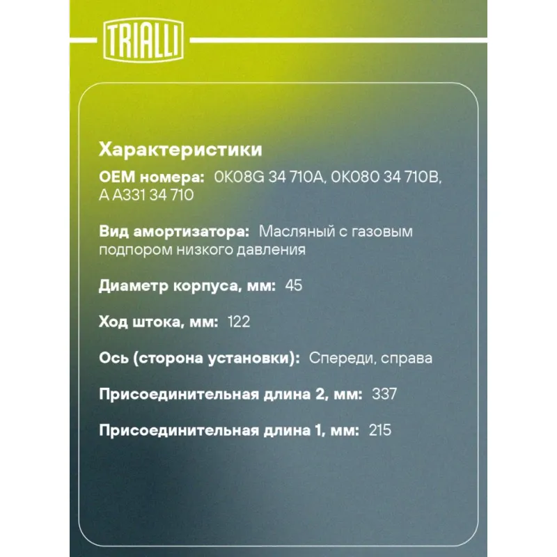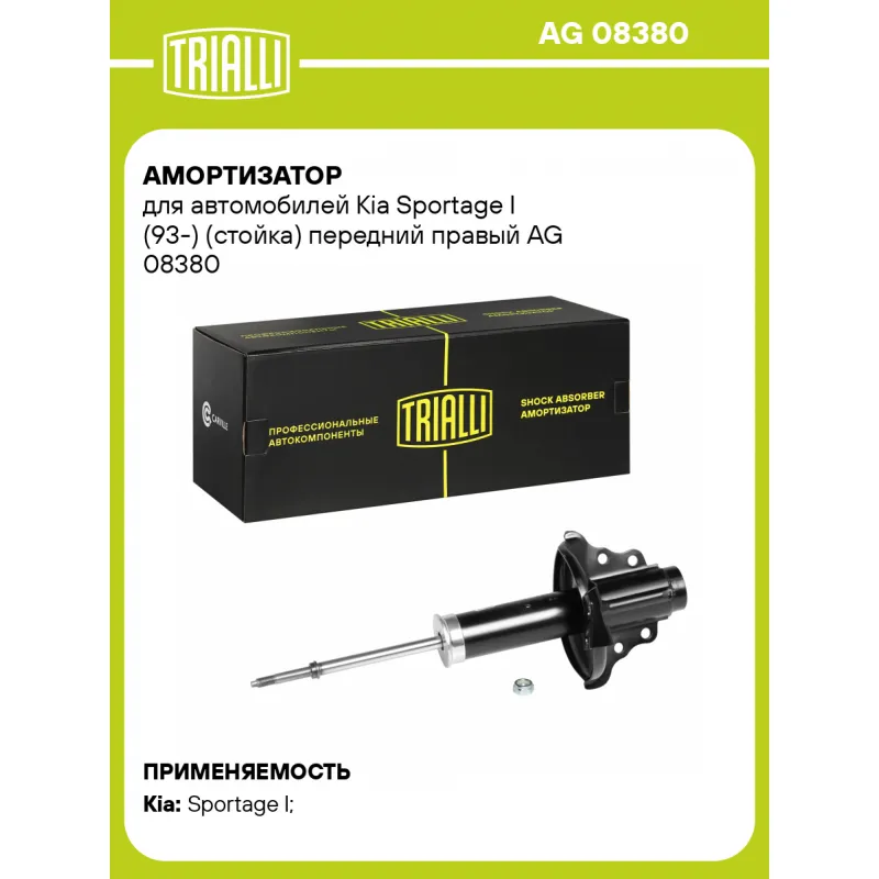 Амортизатор для автомобилей Kia Sportage I (93-) (стойка) передний правый Описание: Амортизатор AG 08380 бренда TRIALLI – это устройство для гашения колебаний (демпфирования) и поглощения толчков и ударов, действующих на раму. Особенности AG 08380: - Вид – Масляный с газовым подпором низкого давления; - Тип – Двухтрубный, гидравлический; Для крепления к деталям кузова или подвески используются крепления: верхнее Шток M10x1.25; и нижнее Спец. кронштейн. Амортизатор в машину (стойка) имеет специальную площадку для установки пружины подвески. Совместим с: KIA SPORTAGE.Подбор по VIN-номеру вашего автомобиля - через кнопку 'Задать вопрос'. Специалист проверит применяемость и ответит вам. Преимущества: - Инновационная технология производства; - Контроль качества каждой позиции по чертежам и с помощью 3D модели; - Сальник NOK; - Высокоэффективная система проектирования; - Гарантия до двух лет или 60 000 км пробега; Амортизаторы автомобильные существенно влияют на комфорт вождения, сокращая вибрации от неровностей дороги, что делает поездку более плавной и приятной. Регулярное и своевременное обслуживание амортизаторов помогут продлить их срок службы и обеспечить надёжную работу. Характеристики: Артикул: AG 08380 OEM номера: 0K08G 34 710A, 0K080 34 710B, A A331 34 710 Товарная линейка: BLACK Парный товар: AG 08179 Количество на автомобиль: 1 Вид амортизатора: Масляный с газовым подпором низкого давления Тип верхнего крепления: Шток Тип нижнего крепления: Спец. кронштейн Диаметр корпуса, мм: 45 Диаметр штока, мм: 12,5 Ход штока, мм: 122 Размер резьбы штока: M10x1.25 Тип амортизатора: Двухтрубный, гидравлический Ось (сторона установки): Спереди, справа Дополнительная информация: Упаковка изделия может отличаться от представленной на фото Присоединительная длина 2, мм: 337 Присоединительная длина 1, мм: 215 Сопутствующий товар: Ремонтные комплекты амортизаторов: BC 1048, BCS 1048 Сопутствующий товар: Амортизаторы: AG 08179, AG 08519 Гарантийный срок: 2 года/60 000 км Подходит для авто: Kia Sportage I (93-) Для проверки применяемости отправьте VIN автомобиля через вкладку "Есть вопросы о товаре?" Комплектация: Амортизатор (стойка) передний - 1 шт Гайка крепежная - 1 шт Гарантия: от 1 года.