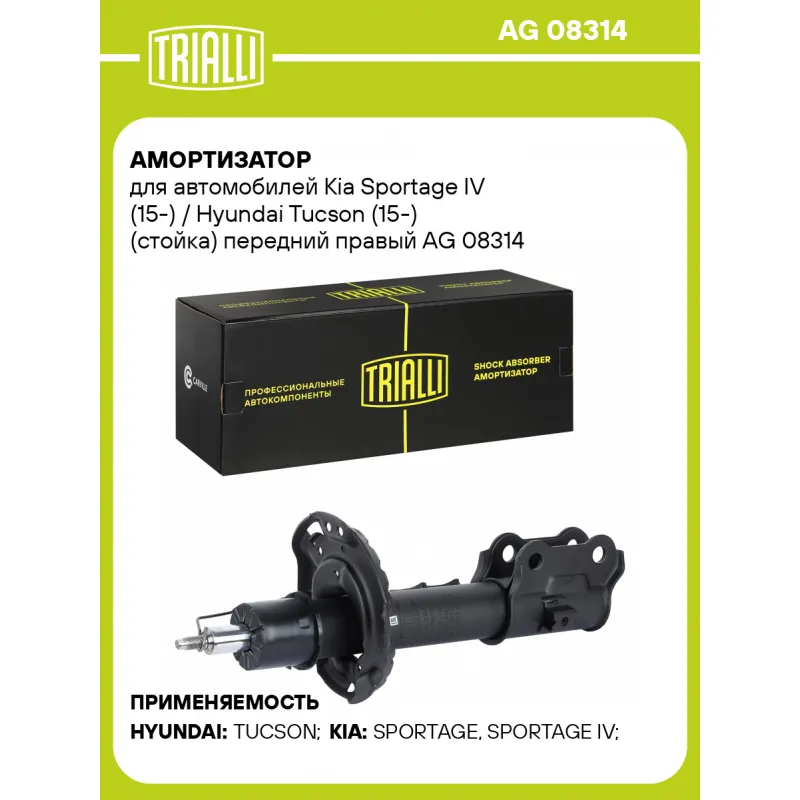 Амортизатор для автомобилей Kia Sportage IV (15-) / Hyundai Tucson (15-) (стойка) передний правый Описание: Амортизатор AG 08314 бренда TRIALLI – это устройство для гашения колебаний (демпфирования) и поглощения толчков и ударов, действующих на раму. Особенности AG 08314: - Вид – Масляный с газовым подпором низкого давления; - Тип – Двухтрубный, гидравлический; Для крепления к деталям кузова или подвески используются крепления: верхнее Шток M12x1,25; и нижнее Скоба. Амортизатор в машину (стойка) имеет специальную площадку для установки пружины подвески. Совместим с: HYUNDAI TUCSON, KIA SPORTAGE.Подбор по VIN-номеру вашего автомобиля - через кнопку 'Задать вопрос'. Специалист проверит применяемость и ответит вам. Преимущества: - Инновационная технология производства; - Контроль качества каждой позиции по чертежам и с помощью 3D модели; - Сальник NOK; - Высокоэффективная система проектирования; - Гарантия до двух лет или 60 000 км пробега; Амортизаторы автомобильные существенно влияют на комфорт вождения, сокращая вибрации от неровностей дороги, что делает поездку более плавной и приятной. Регулярное и своевременное обслуживание амортизаторов помогут продлить их срок службы и обеспечить надёжную работу. Характеристики: Артикул: AG 08314 OEM номера: 54651-F8000, 54650-D7060, 54650-D7050, 54650-D7000, 54660-F1030, 54660-F1550, 54660-F1000, 54660-F1520, 54660-F1010, 54660-F1510, 54660-F1530 Товарная линейка: BLACK Парный товар: AG 08113 Количество на автомобиль: 1 Вид амортизатора: Масляный с газовым подпором низкого давления Тип верхнего крепления: Шток Тип нижнего крепления: Скоба Диаметр корпуса, мм: 54 Диаметр штока, мм: 25 Ход штока, мм: 169 Размер резьбы штока: M12x1,25 Тип амортизатора: Двухтрубный, гидравлический Ось (сторона установки): Спереди, справа Дополнительная информация: Не для а/м с H.P.D. амортизаторами Присоединительная длина 2, мм: 580 Присоединительная длина 1, мм: 411 Сопутствующий товар: Амортизаторы: AG 08113 Гарантийный срок: 2 года/60 000 км Комплектация: Амортизатор (стойка) передний - 1 шт Гайка крепежная - 1 шт Гарантия: от 1 года.