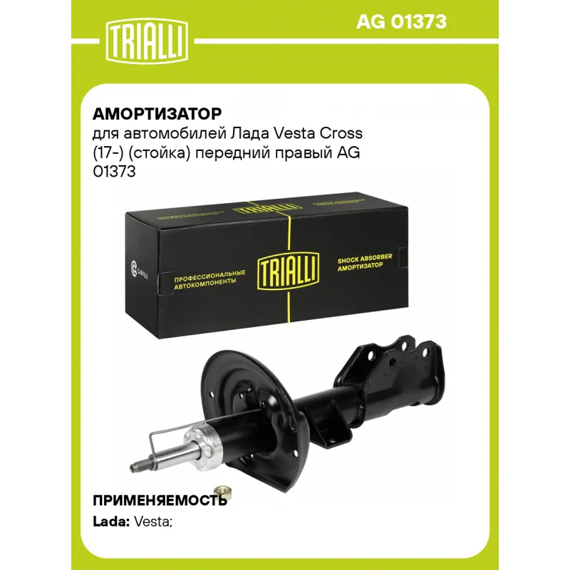 Амортизатор для автомобилей Лада Vesta Cross (17-) (стойка) передний правый Описание: Амортизатор AG 01373 бренда TRIALLI – это устройство для гашения колебаний (демпфирования) и поглощения толчков и ударов, действующих на раму. Особенности AG 01373: - Вид – Масляный с газовым подпором низкого давления; - Тип – Двухтрубный, гидравлический; Для крепления к деталям кузова или подвески используются крепления: верхнее Шток M12x1.25; и нижнее Скоба. Амортизатор в машину (стойка) имеет специальную площадку для установки пружины подвески. Совместим с: HONDA VEZEL, LADA VESTA.Подбор по VIN-номеру вашего автомобиля - через кнопку 'Задать вопрос'. Специалист проверит применяемость и ответит вам. Преимущества: - Инновационная технология производства; - Контроль качества каждой позиции по чертежам и с помощью 3D модели; - Сальник NOK; - Высокоэффективная система проектирования; - Гарантия до двух лет или 60 000 км пробега; Амортизаторы автомобильные существенно влияют на комфорт вождения, сокращая вибрации от неровностей дороги, что делает поездку более плавной и приятной. Регулярное и своевременное обслуживание амортизаторов помогут продлить их срок службы и обеспечить надёжную работу. Характеристики: Артикул: AG 01373 OEM номера: 8450031056, 2180-2905402-20 Товарная линейка: BLACK Парный товар: AG 01172 Количество на автомобиль: 1 Вид амортизатора: Масляный с газовым подпором низкого давления Тип верхнего крепления: Шток Тип нижнего крепления: Скоба Диаметр корпуса, мм: 48,5 Диаметр штока, мм: 20 Ход штока, мм: 155 Размер резьбы штока: M12x1.25 Тип амортизатора: Двухтрубный, гидравлический Ось (сторона установки): Спереди, справа Присоединительная длина 2, мм: 522 Сопутствующий товар: Опоры передних стоек: SA 0158, SA 0160 Присоединительная длина 1, мм: 367 Сопутствующий товар: Ремонтные комплекты амортизаторов: BC 0104, BC 0134, BCS 0104, BC 1848, BCS 1848,BC 0185, BCS 0155, BC 0155 Сопутствующий товар: Амортизаторы: AG 01172,AG 01164, AG 01365, AG 01519, AG 01515 Гарантийный срок: 2 года/60 000 км Подходит для авто: ВАЗ Vesta (15-) Для проверки применяемости отправьте VIN автомобиля через вкладку "Есть вопросы о товаре?" Комплектация: Амортизатор (стойка) передний - 1 шт Гайка крепежная - 1 шт Гарантия: от 1 года.