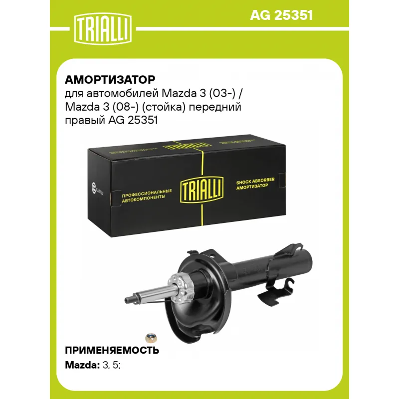 Амортизатор для автомобилей Mazda 3 (03-) / Mazda 3 (08-) (стойка) передний правый Описание: Амортизатор AG 25351 бренда TRIALLI – это устройство для гашения колебаний (демпфирования) и поглощения толчков и ударов, действующих на раму. Особенности AG 25351: - Вид – Масляный с газовым подпором низкого давления; - Тип – Двухтрубный, гидравлический; Для крепления к деталям кузова или подвески используются крепления: верхнее Шток M12x1.25; и нижнее Зажим. Амортизатор в машину (стойка) имеет специальную площадку для установки пружины подвески. Совместим с: MAZDA 3, 5.Подбор по VIN-номеру вашего автомобиля - через кнопку 'Задать вопрос'. Специалист проверит применяемость и ответит вам. Преимущества: - Инновационная технология производства; - Контроль качества каждой позиции по чертежам и с помощью 3D модели; - Сальник NOK; - Высокоэффективная система проектирования; - Гарантия до двух лет или 60 000 км пробега; Амортизаторы автомобильные существенно влияют на комфорт вождения, сокращая вибрации от неровностей дороги, что делает поездку более плавной и приятной. Регулярное и своевременное обслуживание амортизаторов помогут продлить их срок службы и обеспечить надёжную работу. Характеристики: Артикул: AG 25351 OEM номера: B32T34700C, B32T34700D, B32T34700E, B39D34700A, BBM234700A, BBM334700A, BBM334700C, BBP834700, BN9A34700, BP4K34700E, BP4K34700F, BP4K34700G, BP4L34700, BP4T34700, BP6J34700, BR5S34700A, BR5V34700, BR5V34700A, BR5V34700B, BR5V34700C, BS1A34700, C23634700A, C23634700B, C23634700C, CC2934700, CC3034700C, CC3034700D, BBM234700C, BBP834700A, CDY034700, CD8534700, CD8534700A, CD8534700B, CD9834700, CD9834700A, CD9834700B, BBL334700, BBL334700A, BBL334700B, BEK634700B, BRY034700, BR5S34700B, BR5S34700C, 3N6118045AAK, 3N6118045ACJ, 6N6118045JAC, 8N6118045AD Товарная линейка: BLACK Парный товар: AG 25150 Количество на автомобиль: 1 Вид амортизатора: Масляный с газовым подпором низкого давления Тип верхнего крепления: Шток Тип нижнего крепления: Зажим Диаметр корпуса, мм: 52 Диаметр штока, мм: 22 Ход штока, мм: 170 Размер резьбы штока: M12x1.25 Тип амортизатора: Двухтрубный, гидравлический Ось (сторона установки): Спереди, справа Дополнительная информация: Упаковка изделия может отличаться от представленной на фото Присоединительная длина 2, мм: 501 Присоединительная длина 1, мм: 331 Сопутствующий товар: Ремонтные комплекты амортизаторов: BC 1001, BC 1031, BCS 1001, BC 1948, BC 1966, BCS 2066,BC 1082, BCS 18102 Сопутствующий товар: Амортизаторы: AG 25150, AG 25501 Гарантийный срок: 2 года/60 000 км Подходит для авто: Mazda 3 (03-), 3 (09-), 5 (05-), 3 (03-), 5 (05-) Для проверки применяемости отправьте VIN автомобиля через вкладку "Есть вопросы о товаре?" Комплектация: Амортизатор (стойка) передний - 1 шт Гайка крепежная - 1 шт Гарантия: от 1 года.
