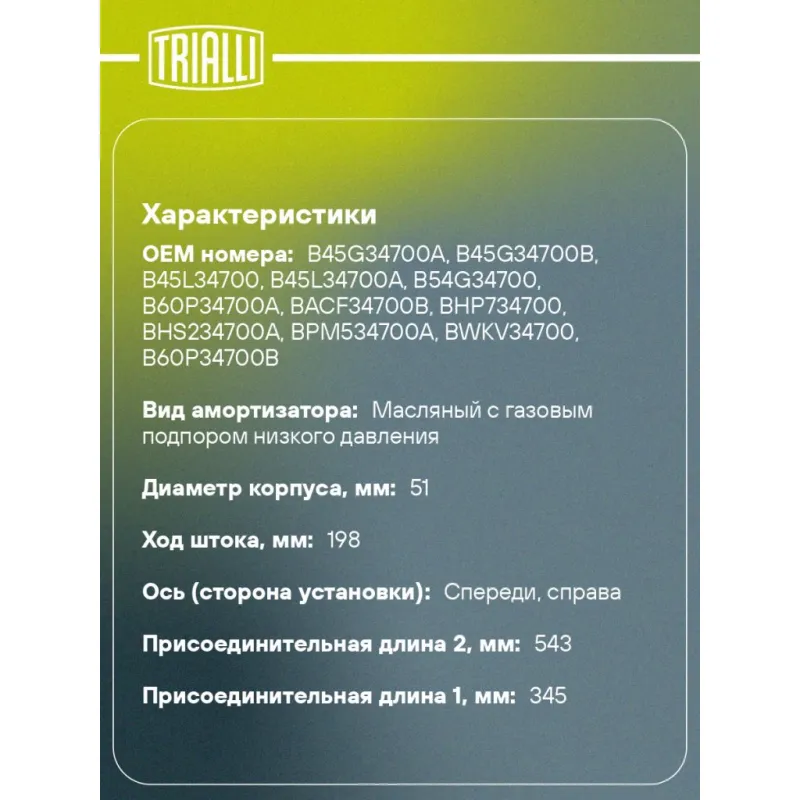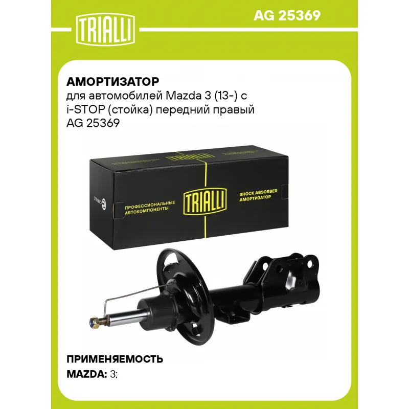 Амортизатор для автомобилей Mazda 3 (13-) с i-STOP (стойка) передний правый Описание: Амортизатор AG 25369 бренда TRIALLI – это устройство для гашения колебаний (демпфирования) и поглощения толчков и ударов, действующих на раму. Особенности AG 25369: - Вид – Масляный с газовым подпором низкого давления; - Тип – Двухтрубный, гидравлический; Для крепления к деталям кузова или подвески используются крепления: верхнее Шток M12x1.25; и нижнее Скоба. Амортизатор в машину (стойка) имеет специальную площадку для установки пружины подвески. Совместим с: MAZDA 3.Подбор по VIN-номеру вашего автомобиля - через кнопку 'Задать вопрос'. Специалист проверит применяемость и ответит вам. Преимущества: - Инновационная технология производства; - Контроль качества каждой позиции по чертежам и с помощью 3D модели; - Сальник NOK; - Высокоэффективная система проектирования; - Гарантия до двух лет или 60 000 км пробега; Амортизаторы автомобильные существенно влияют на комфорт вождения, сокращая вибрации от неровностей дороги, что делает поездку более плавной и приятной. Регулярное и своевременное обслуживание амортизаторов помогут продлить их срок службы и обеспечить надёжную работу. Характеристики: Артикул: AG 25369 OEM номера: B45G34700A, B45G34700B, B45L34700, B45L34700A, B54G34700, B60P34700A, BACF34700B, BHP734700, BHS234700A, BPM534700A, BWKV34700, B60P34700B, B62V34700A, B64B34700, BABH34700A, BABH34700B, BACF34700A Товарная линейка: BLACK Парный товар: AG 25168 Количество на автомобиль: 1 Вид амортизатора: Масляный с газовым подпором низкого давления Тип верхнего крепления: Шток Тип нижнего крепления: Скоба Диаметр корпуса, мм: 51 Диаметр штока, мм: 22 Ход штока, мм: 198 Размер резьбы штока: M12x1.25 Тип амортизатора: Двухтрубный, гидравлический Ось (сторона установки): Спереди, справа Дополнительная информация: Упаковка изделия может отличаться от представленной на фото Присоединительная длина 2, мм: 543 Присоединительная длина 1, мм: 345 Сопутствующий товар: Амортизаторы: AG 25168 Гарантийный срок: 2 года/60 000 км Комплектация: Гайка крепежная - 1 шт Амортизатор (стойка) передний - 1 шт Гарантия: от 1 года.