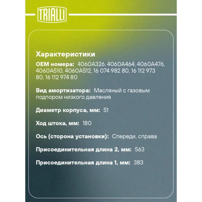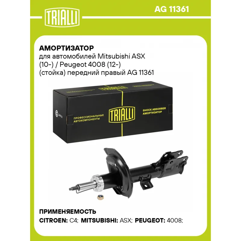 Амортизатор для автомобилей Mitsubishi ASX (10-) / Peugeot 4008 (12-) (стойка) передний правый Описание: Амортизатор AG 11361 бренда TRIALLI – это устройство для гашения колебаний (демпфирования) и поглощения толчков и ударов, действующих на раму. Особенности AG 11361: - Вид – Масляный с газовым подпором низкого давления; - Тип – Двухтрубный, гидравлический; Для крепления к деталям кузова или подвески используются крепления: верхнее Шток M12x1,25; и нижнее Скоба. Амортизатор в машину (стойка) имеет специальную площадку для установки пружины подвески. Совместим с: CITROEN C4 AIRCROSS, MITSUBISHI ASX, PEUGEOT 4008.Подбор по VIN-номеру вашего автомобиля - через кнопку 'Задать вопрос'. Специалист проверит применяемость и ответит вам. Преимущества: - Инновационная технология производства; - Контроль качества каждой позиции по чертежам и с помощью 3D модели; - Сальник NOK; - Высокоэффективная система проектирования; - Гарантия до двух лет или 60 000 км пробега; Амортизаторы автомобильные существенно влияют на комфорт вождения, сокращая вибрации от неровностей дороги, что делает поездку более плавной и приятной. Регулярное и своевременное обслуживание амортизаторов помогут продлить их срок службы и обеспечить надёжную работу. Характеристики: Артикул: AG 11361 OEM номера: 4060A326, 4060A464, 4060A476, 4060A510, 4060A512, 16 074 982 80, 16 112 973 80, 16 112 974 80 Товарная линейка: BLACK Парный товар: AG 11160 Количество на автомобиль: 1 Вид амортизатора: Масляный с газовым подпором низкого давления Тип верхнего крепления: Шток Тип нижнего крепления: Скоба Диаметр корпуса, мм: 51 Диаметр штока, мм: 22 Ход штока, мм: 180 Размер резьбы штока: M12x1,25 Тип амортизатора: Двухтрубный, гидравлический Ось (сторона установки): Спереди, справа Присоединительная длина 2, мм: 563 Сопутствующий товар: Опоры передних стоек: SA 1151; SA 1153 Присоединительная длина 1, мм: 383 Сопутствующий товар: Ремонтные комплекты амортизаторов: BC 1966, BCS 2066 Сопутствующий товар: Амортизаторы: AG 11160, AG 11513 Гарантийный срок: 2 года/60 000 км Комплектация: Гайка крепежная - 1 шт Амортизатор (стойка) передний - 1 шт Гарантия: от 1 года.
