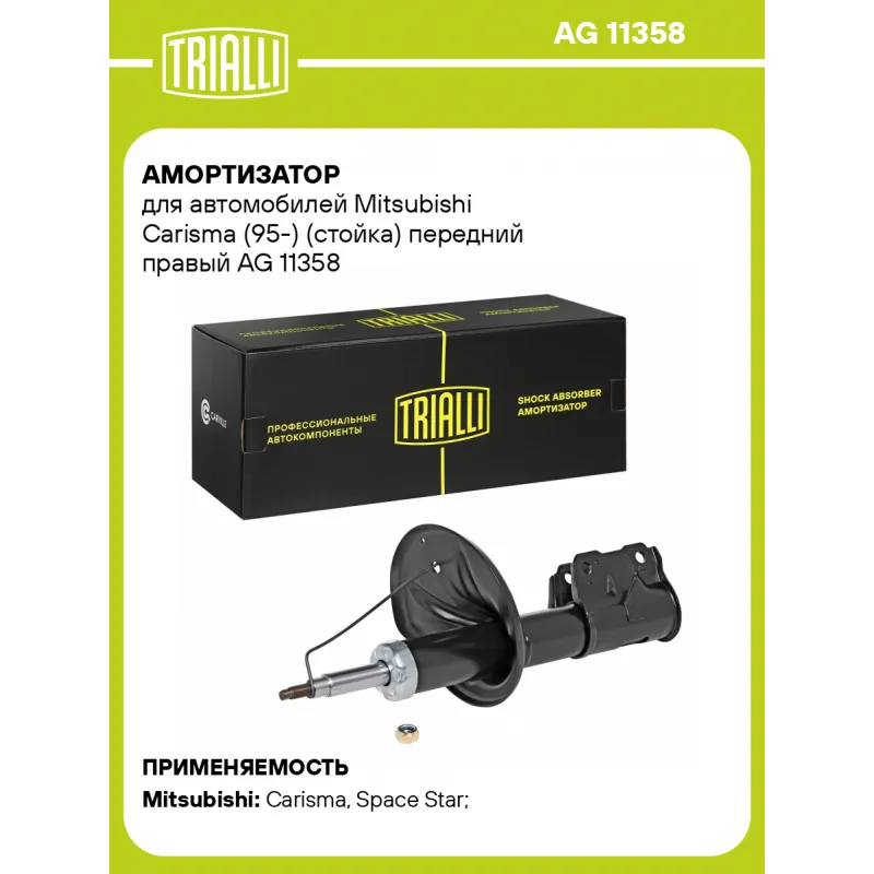 Амортизатор для автомобилей Mitsubishi Carisma (95-) (стойка) передний правый Описание: Амортизатор AG 11358 бренда TRIALLI – это устройство для гашения колебаний (демпфирования) и поглощения толчков и ударов, действующих на раму. Особенности AG 11358: - Вид – Масляный с газовым подпором низкого давления; - Тип – Двухтрубный, гидравлический; Для крепления к деталям кузова или подвески используются крепления: верхнее Шток M12x1.25; и нижнее Скоба. Амортизатор в машину (стойка) имеет специальную площадку для установки пружины подвески. Совместим с: MITSUBISHI CARISMA, SPACE STAR.Подбор по VIN-номеру вашего автомобиля - через кнопку 'Задать вопрос'. Специалист проверит применяемость и ответит вам. Преимущества: - Инновационная технология производства; - Контроль качества каждой позиции по чертежам и с помощью 3D модели; - Сальник NOK; - Высокоэффективная система проектирования; - Гарантия до двух лет или 60 000 км пробега; Амортизаторы автомобильные существенно влияют на комфорт вождения, сокращая вибрации от неровностей дороги, что делает поездку более плавной и приятной. Регулярное и своевременное обслуживание амортизаторов помогут продлить их срок службы и обеспечить надёжную работу. Характеристики: Артикул: AG 11358 OEM номера: MR913131, MR369112 Товарная линейка: BLACK Парный товар: AG 11157 Количество на автомобиль: 1 Вид амортизатора: Масляный с газовым подпором низкого давления Тип верхнего крепления: Шток Тип нижнего крепления: Скоба Диаметр корпуса, мм: 51 Диаметр штока, мм: 22 Ход штока, мм: 167 Размер резьбы штока: M12x1.25 Тип амортизатора: Двухтрубный, гидравлический Ось (сторона установки): Спереди, справа Дополнительная информация: Для а/м после 03.99 г.в. Присоединительная длина 2, мм: 486 Присоединительная длина 1, мм: 319 Сопутствующий товар: Ремонтные комплекты амортизаторов: BC 1948, BCS 2048 Сопутствующий товар: Амортизаторы: AG 11157, AG 11512 Гарантийный срок: 2 года/60 000 км Индивидуальные характеристики: Не для а/м с повышенным дорожным просветом Подходит для авто: Mitsubishi Carisma (95-), Space Star (01-), Carisma (95-), Space Star (01-) Для проверки применяемости отправьте VIN автомобиля через вкладку "Есть вопросы о товаре?" Комплектация: Амортизатор (стойка) передний - 1 шт Гайка крепежная - 1 шт Гарантия: от 1 года.