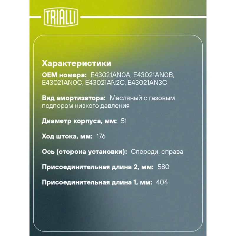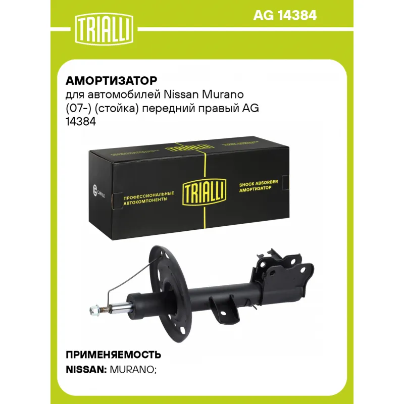 Амортизатор для автомобилей Nissan Murano (07-) (стойка) передний правый Описание: Амортизатор AG 14384 бренда TRIALLI – это устройство для гашения колебаний (демпфирования) и поглощения толчков и ударов, действующих на раму. Особенности AG 14384: - Вид – Масляный с газовым подпором низкого давления; - Тип – Двухтрубный, гидравлический; Для крепления к деталям кузова или подвески используются крепления: верхнее Шток M12x1,25; и нижнее Скоба. Амортизатор в машину (стойка) имеет специальную площадку для установки пружины подвески. Совместим с: NISSAN MURANO.Подбор по VIN-номеру вашего автомобиля - через кнопку 'Задать вопрос'. Специалист проверит применяемость и ответит вам. Преимущества: - Инновационная технология производства; - Контроль качества каждой позиции по чертежам и с помощью 3D модели; - Сальник NOK; - Высокоэффективная система проектирования; - Гарантия до двух лет или 60 000 км пробега; Амортизаторы автомобильные существенно влияют на комфорт вождения, сокращая вибрации от неровностей дороги, что делает поездку более плавной и приятной. Регулярное и своевременное обслуживание амортизаторов помогут продлить их срок службы и обеспечить надёжную работу. Характеристики: Артикул: AG 14384 OEM номера: E43021AN0A, E43021AN0B, E43021AN0C, E43021AN2C, E43021AN3C Товарная линейка: BLACK Парный товар: AG 14183 Количество на автомобиль: 1 Вид амортизатора: Масляный с газовым подпором низкого давления Тип верхнего крепления: Шток Тип нижнего крепления: Скоба Диаметр корпуса, мм: 51 Диаметр штока, мм: 22 Ход штока, мм: 176 Размер резьбы штока: M12x1,25 Тип амортизатора: Двухтрубный, гидравлический Ось (сторона установки): Спереди, справа Дополнительная информация: Упаковка изделия может отличаться от представленной на фото Присоединительная длина 2, мм: 580 Присоединительная длина 1, мм: 404 Сопутствующий товар: Амортизаторы: AG 14183, AG 14518 Гарантийный срок: 2 года/60 000 км Комплектация: Гайка крепежная - 1 шт Амортизатор (стойка) передний - 1 шт Гарантия: от 1 года.