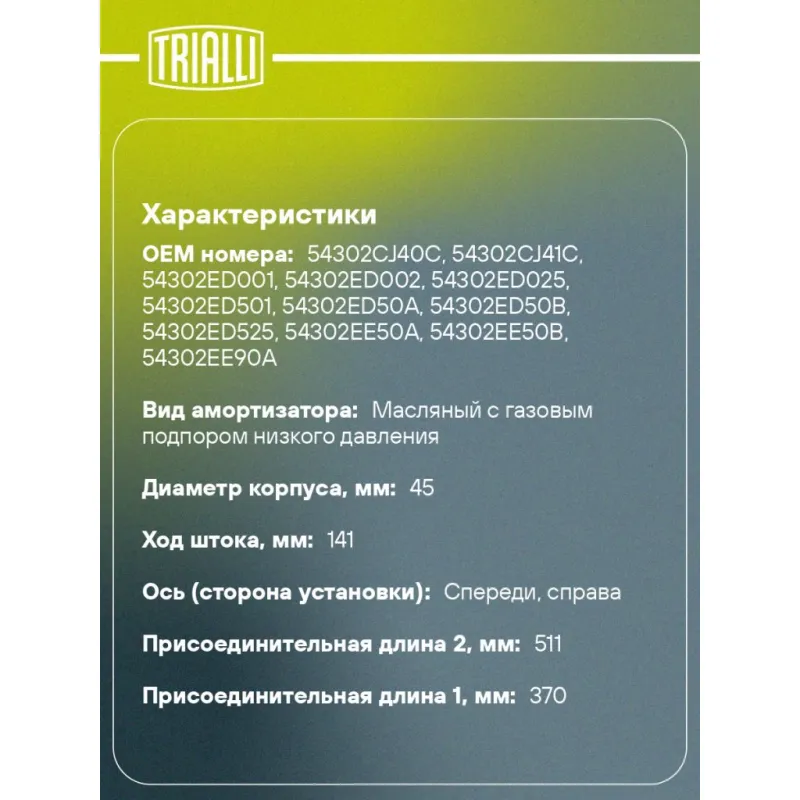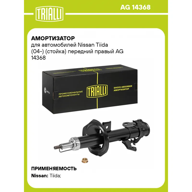 Амортизатор для автомобилей Nissan Tiida (04-) (стойка) передний правый Описание: Амортизатор AG 14368 бренда TRIALLI – это устройство для гашения колебаний (демпфирования) и поглощения толчков и ударов, действующих на раму. Особенности AG 14368: - Вид – Масляный с газовым подпором низкого давления; - Тип – Двухтрубный, гидравлический; Для крепления к деталям кузова или подвески используются крепления: верхнее Шток M12x1.25; и нижнее Скоба. Амортизатор в машину (стойка) имеет специальную площадку для установки пружины подвески. Совместим с: NISSAN TIIDA.Подбор по VIN-номеру вашего автомобиля - через кнопку 'Задать вопрос'. Специалист проверит применяемость и ответит вам. Преимущества: - Инновационная технология производства; - Контроль качества каждой позиции по чертежам и с помощью 3D модели; - Сальник NOK; - Высокоэффективная система проектирования; - Гарантия до двух лет или 60 000 км пробега; Амортизаторы автомобильные существенно влияют на комфорт вождения, сокращая вибрации от неровностей дороги, что делает поездку более плавной и приятной. Регулярное и своевременное обслуживание амортизаторов помогут продлить их срок службы и обеспечить надёжную работу. Характеристики: Артикул: AG 14368 OEM номера: 54302CJ40C, 54302CJ41C, 54302ED001, 54302ED002, 54302ED025, 54302ED501, 54302ED50A, 54302ED50B, 54302ED525, 54302EE50A, 54302EE50B, 54302EE90A, 54302EF80A, 54302EL00A, 54302EM01A, 54302EM30C, E4302EC80A, E4302EE90A, E4302EL00A, E4302EM01A, E4302EM20A, E4302EM30C Товарная линейка: BLACK Парный товар: AG 14167 Количество на автомобиль: 1 Вид амортизатора: Масляный с газовым подпором низкого давления Тип верхнего крепления: Шток Тип нижнего крепления: Скоба Диаметр корпуса, мм: 45 Диаметр штока, мм: 20 Ход штока, мм: 141 Размер резьбы штока: M12x1.25 Тип амортизатора: Двухтрубный, гидравлический Ось (сторона установки): Спереди, справа Дополнительная информация: Упаковка изделия может отличаться от представленной на фото Присоединительная длина 2, мм: 511 Присоединительная длина 1, мм: 370 Сопутствующий товар: Ремонтные комплекты амортизаторов: BC 1848, BCS 1848 Сопутствующий товар: Амортизаторы: AG 14167, AG 14511 Гарантийный срок: 2 года/60 000 км Подходит для авто: Nissan Tiida (04-) Для проверки применяемости отправьте VIN автомобиля через вкладку "Есть вопросы о товаре?" Комплектация: Амортизатор (стойка) передний - 1 шт Гайка крепежная - 1 шт Гарантия: от 1 года.