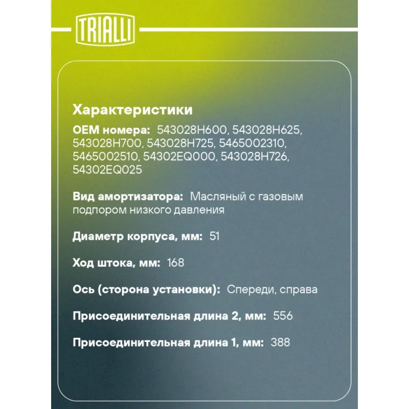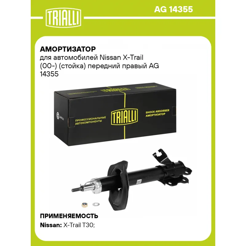 Амортизатор для автомобилей Nissan X-Trail (00-) (стойка) передний правый Описание: Амортизатор AG 14355 бренда TRIALLI – это устройство для гашения колебаний (демпфирования) и поглощения толчков и ударов, действующих на раму. Особенности AG 14355: - Вид – Масляный с газовым подпором низкого давления; - Тип – Двухтрубный, гидравлический; Для крепления к деталям кузова или подвески используются крепления: верхнее Шток M12x1.25; и нижнее Скоба. Амортизатор в машину (стойка) имеет специальную площадку для установки пружины подвески. Совместим с: NISSAN X-TRAIL.Подбор по VIN-номеру вашего автомобиля - через кнопку 'Задать вопрос'. Специалист проверит применяемость и ответит вам. Преимущества: - Инновационная технология производства; - Контроль качества каждой позиции по чертежам и с помощью 3D модели; - Сальник NOK; - Высокоэффективная система проектирования; - Гарантия до двух лет или 60 000 км пробега; Амортизаторы автомобильные существенно влияют на комфорт вождения, сокращая вибрации от неровностей дороги, что делает поездку более плавной и приятной. Регулярное и своевременное обслуживание амортизаторов помогут продлить их срок службы и обеспечить надёжную работу. Характеристики: Артикул: AG 14355 OEM номера: 543028H600, 543028H625, 543028H700, 543028H725, 5465002310, 5465002510, 54302EQ000, 543028H726, 54302EQ025 Товарная линейка: BLACK Парный товар: AG 14154 Количество на автомобиль: 1 Вид амортизатора: Масляный с газовым подпором низкого давления Тип верхнего крепления: Шток Тип нижнего крепления: Скоба Диаметр корпуса, мм: 51 Диаметр штока, мм: 22 Ход штока, мм: 168 Размер резьбы штока: M12x1.25 Тип амортизатора: Двухтрубный, гидравлический Ось (сторона установки): Спереди, справа Дополнительная информация: Упаковка изделия может отличаться от представленной на фото Присоединительная длина 2, мм: 556 Присоединительная длина 1, мм: 388 Сопутствующий товар: Ремонтные комплекты амортизаторов: BC 1948, BCS 2048 Сопутствующий товар: Амортизаторы: AG 14154, AG 14404, AG 14203 Гарантийный срок: 2 года/60 000 км Подходит для авто: Nissan X-Trail T30 (01-), X-Trail T30 (01-) Для проверки применяемости отправьте VIN автомобиля через вкладку "Есть вопросы о товаре?" Комплектация: Амортизатор (стойка) передний - 1 шт Гайка крепежная - 1 шт Гарантия: от 1 года.