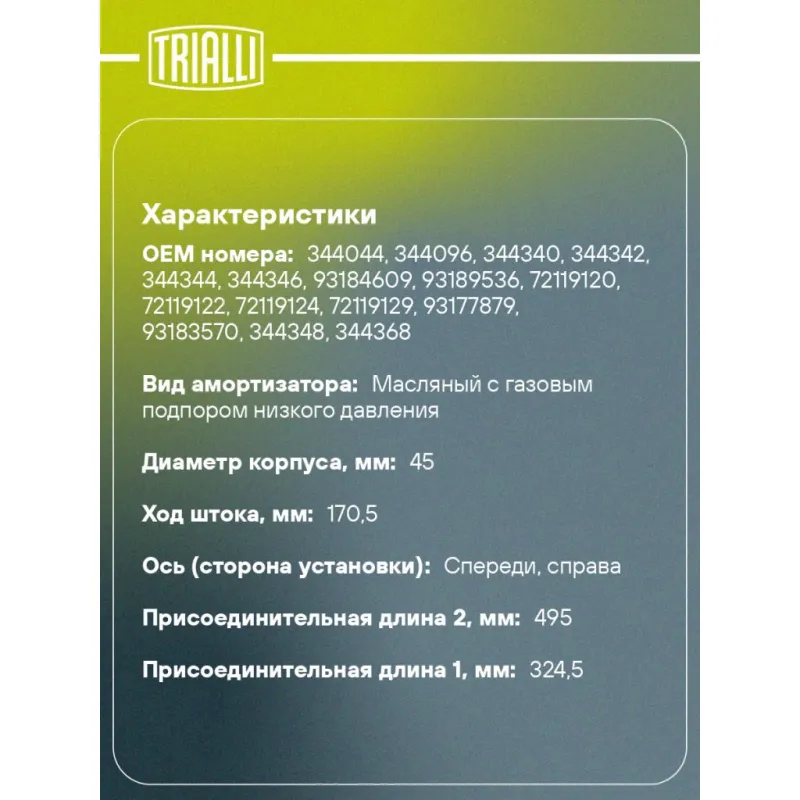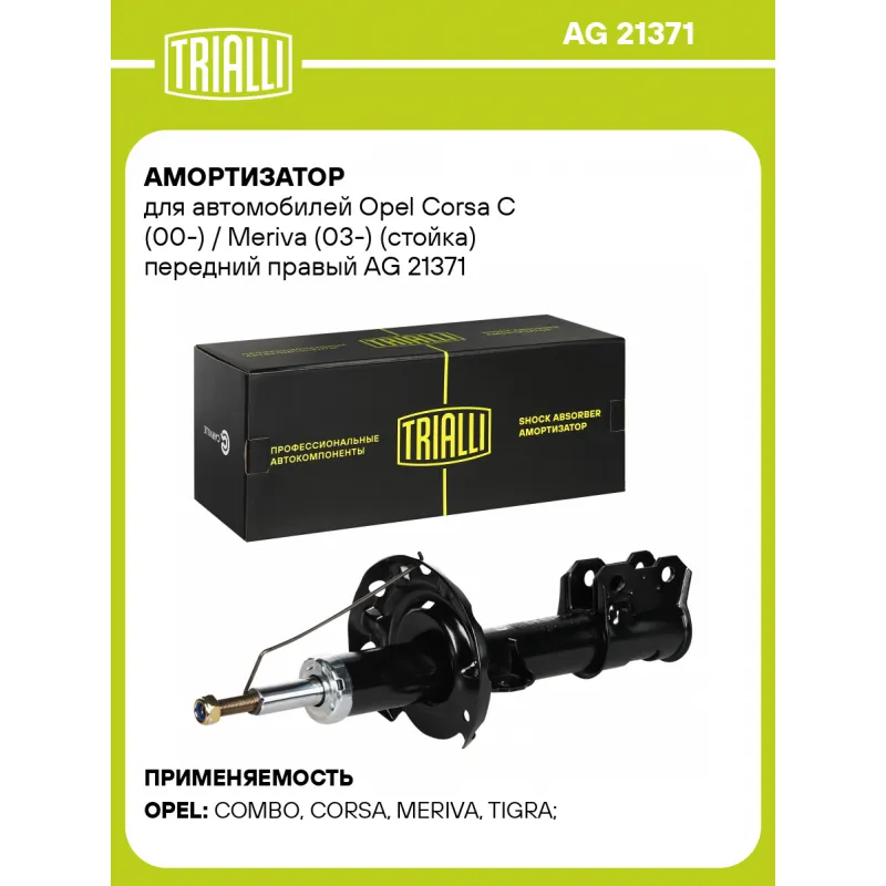Амортизатор для автомобилей Opel Corsa C (00-) / Meriva (03-) (стойка) передний правый Описание: Амортизатор AG 21371 бренда TRIALLI – это устройство для гашения колебаний (демпфирования) и поглощения толчков и ударов, действующих на раму. Особенности AG 21371: - Вид – Масляный с газовым подпором низкого давления; - Тип – Двухтрубный, гидравлический; Для крепления к деталям кузова или подвески используются крепления: верхнее Шток M12x1.25; и нижнее Скоба. Амортизатор в машину (стойка) имеет специальную площадку для установки пружины подвески. Совместим с: OPEL COMBO, CORSA, MERIVA, TIGRA.Подбор по VIN-номеру вашего автомобиля - через кнопку 'Задать вопрос'. Специалист проверит применяемость и ответит вам. Преимущества: - Инновационная технология производства; - Контроль качества каждой позиции по чертежам и с помощью 3D модели; - Сальник NOK; - Высокоэффективная система проектирования; - Гарантия до двух лет или 60 000 км пробега; Амортизаторы автомобильные существенно влияют на комфорт вождения, сокращая вибрации от неровностей дороги, что делает поездку более плавной и приятной. Регулярное и своевременное обслуживание амортизаторов помогут продлить их срок службы и обеспечить надёжную работу. Характеристики: Артикул: AG 21371 OEM номера: 344044, 344096, 344340, 344342, 344344, 344346, 93184609, 93189536, 72119120, 72119122, 72119124, 72119129, 93177879, 93183570, 344348, 344368, 344390, 344456, 72119116, 72119118 Товарная линейка: BLACK Парный товар: AG 21170 Количество на автомобиль: 1 Вид амортизатора: Масляный с газовым подпором низкого давления Тип верхнего крепления: Шток Тип нижнего крепления: Скоба Диаметр корпуса, мм: 45 Диаметр штока, мм: 20 Ход штока, мм: 170.5 Размер резьбы штока: M12x1.25 Тип амортизатора: Двухтрубный, гидравлический Ось (сторона установки): Спереди, справа Дополнительная информация: Упаковка изделия может отличаться от представленной на фото Присоединительная длина 2, мм: 495 Присоединительная длина 1, мм: 324.5 Сопутствующий товар: Амортизаторы: AG 21170, AG 21508 Гарантийный срок: 2 года/60 000 км Комплектация: Амортизатор (стойка) передний - 1 шт Гайка крепежная - 1 шт Гарантия: от 1 года.