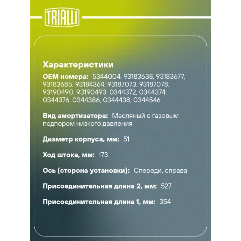 Амортизатор для автомобилей Opel Vectra C (02-) (стойка) передний правый (аналог KYB 334634) Описание: Амортизатор AG 21357 бренда TRIALLI – это устройство для гашения колебаний (демпфирования) и поглощения толчков и ударов, действующих на раму. Особенности AG 21357: - Вид – Масляный с газовым подпором низкого давления ; - Тип – Двухтрубный, гидравлический; Для крепления к деталям кузова или подвески используются крепления: верхнее Шток M14x1.5; и нижнее Скоба. Амортизатор в машину (стойка) имеет специальную площадку для установки пружины подвески. Совместим с: OPEL VECTRA.Подбор по VIN-номеру вашего автомобиля - через кнопку 'Задать вопрос'. Специалист проверит применяемость и ответит вам. Преимущества: - Инновационная технология производства; - Контроль качества каждой позиции по чертежам и с помощью 3D модели; - Сальник NOK; - Высокоэффективная система проектирования; - Гарантия до двух лет или 60 000 км пробега; Амортизаторы автомобильные существенно влияют на комфорт вождения, сокращая вибрации от неровностей дороги, что делает поездку более плавной и приятной. Регулярное и своевременное обслуживание амортизаторов помогут продлить их срок службы и обеспечить надёжную работу. Характеристики: Артикул: AG 21357 OEM номера: 5344004, 93183638, 93183677, 93183685, 93184364, 93187073, 93187078, 93190490, 93190493, 0344372, 0344374, 0344376, 0344386, 0344438, 0344546, 0344548, 0344564 Товарная линейка: BLACK Парный товар: AG 21156 Количество на автомобиль: 1 Вид амортизатора: Масляный с газовым подпором низкого давления Тип верхнего крепления: Шток Тип нижнего крепления: Скоба Диаметр корпуса, мм: 51 Диаметр штока, мм: 22 Ход штока, мм: 173 Размер резьбы штока: M14x1.5 Тип амортизатора: Двухтрубный, гидравлический Ось (сторона установки): Спереди, справа Дополнительная информация: Упаковка изделия может отличаться от представленной на фото Присоединительная длина 2, мм: 527 Присоединительная длина 1, мм: 354 Сопутствующий товар: Ремонтные комплекты амортизаторов: BC 1948, BC 1966, BCS 2066 Сопутствующий товар: Амортизаторы: AG 21156, AG 21509 Гарантийный срок: 2 года/60 000 км Подходит для авто: Opel Vectra C (02-), Vectra C (02-), Vectra C (02-) Для проверки применяемости отправьте VIN автомобиля через вкладку "Есть вопросы о товаре?" Комплектация: Амортизатор (стойка) передний - 1 шт Гайка крепежная - 1 шт Гарантия: от 1 года.