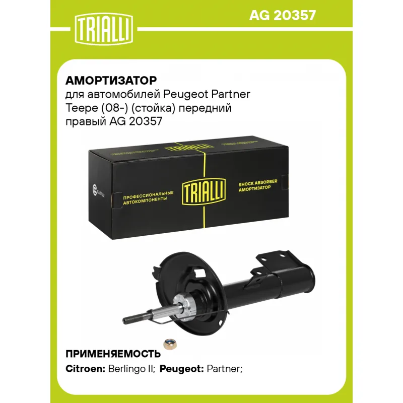 Амортизатор для автомобилей Peugeot Partner Teepe (08-) (стойка) передний правый Описание: Амортизатор AG 20357 бренда TRIALLI – это устройство для гашения колебаний (демпфирования) и поглощения толчков и ударов, действующих на раму. Особенности AG 20357: - Вид – Масляный с газовым подпором низкого давления; - Тип – Двухтрубный, гидравлический; Для крепления к деталям кузова или подвески используются крепления: верхнее Шток M 14x1.5; и нижнее Скоба. Амортизатор в машину (стойка) имеет специальную площадку для установки пружины подвески. Совместим с: CITROEN BERLINGO, PEUGEOT PARTNER TEPEE, PARTNER.Подбор по VIN-номеру вашего автомобиля - через кнопку 'Задать вопрос'. Специалист проверит применяемость и ответит вам. Преимущества: - Инновационная технология производства; - Контроль качества каждой позиции по чертежам и с помощью 3D модели; - Сальник NOK; - Высокоэффективная система проектирования; - Гарантия до двух лет или 60 000 км пробега; Амортизаторы автомобильные существенно влияют на комфорт вождения, сокращая вибрации от неровностей дороги, что делает поездку более плавной и приятной. Регулярное и своевременное обслуживание амортизаторов помогут продлить их срок службы и обеспечить надёжную работу. Характеристики: Артикул: AG 20357 OEM номера: 520874, 520878, 520882, 520886, 5208X6, 9684108480, 9684479180, 520876, 520880, 520888, 520884 Товарная линейка: BLACK Парный товар: AG 20156 Количество на автомобиль: 1 Вид амортизатора: Масляный с газовым подпором низкого давления Тип верхнего крепления: Шток Тип нижнего крепления: Скоба Диаметр корпуса, мм: 51 Диаметр штока, мм: 20 Ход штока, мм: 165 Размер резьбы штока: M 14x1.5 Тип амортизатора: Двухтрубный, гидравлический Ось (сторона установки): Спереди, справа Дополнительная информация: Упаковка изделия может отличаться от представленной на фото Присоединительная длина 2, мм: 502 Присоединительная длина 1, мм: 337 Сопутствующий товар: Ремонтные комплекты амортизаторов: BC 1848, BCS 1848 Сопутствующий товар: Амортизаторы: AG 20156, AG 20504 Гарантийный срок: 2 года/60 000 км Подходит для авто: Citroen Berlingo II (08-) Peugeot Partner (08-) Для проверки применяемости отправьте VIN автомобиля через вкладку "Есть вопросы о товаре?" Комплектация: Амортизатор (стойка) передний - 1 шт Гайка крепежная - 1 шт Гарантия: от 1 года.