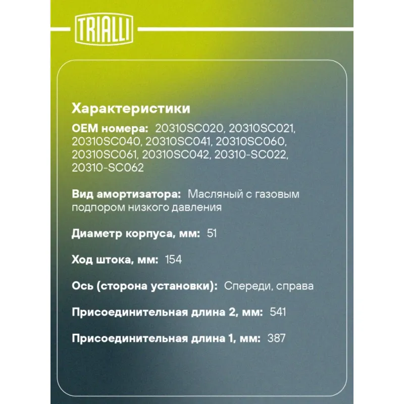 Амортизатор для автомобилей Subaru Forester (08-) (стойка) передний правый Описание: Амортизатор AG 22355 бренда TRIALLI – это устройство для гашения колебаний (демпфирования) и поглощения толчков и ударов, действующих на раму. Особенности AG 22355: - Вид – Масляный с газовым подпором низкого давления; - Тип – Двухтрубный, гидравлический; Для крепления к деталям кузова или подвески используются крепления: верхнее Шток M14x1.5; и нижнее Скоба. Амортизатор в машину (стойка) имеет специальную площадку для установки пружины подвески. Совместим с: SUBARU FORESTER.Подбор по VIN-номеру вашего автомобиля - через кнопку 'Задать вопрос'. Специалист проверит применяемость и ответит вам. Преимущества: - Инновационная технология производства; - Контроль качества каждой позиции по чертежам и с помощью 3D модели; - Сальник NOK; - Высокоэффективная система проектирования; - Гарантия до двух лет или 60 000 км пробега; Амортизаторы автомобильные существенно влияют на комфорт вождения, сокращая вибрации от неровностей дороги, что делает поездку более плавной и приятной. Регулярное и своевременное обслуживание амортизаторов помогут продлить их срок службы и обеспечить надёжную работу. Характеристики: Артикул: AG 22355 OEM номера: 20310SC020, 20310SC021, 20310SC040, 20310SC041, 20310SC060, 20310SC061, 20310SC042, 20310-SC022, 20310-SC062 Товарная линейка: BLACK Парный товар: AG 22154 Количество на автомобиль: 1 Вид амортизатора: Масляный с газовым подпором низкого давления Тип верхнего крепления: Шток Тип нижнего крепления: Скоба Диаметр корпуса, мм: 51 Диаметр штока, мм: 22 Ход штока, мм: 154 Размер резьбы штока: M14x1.5 Тип амортизатора: Двухтрубный, гидравлический Ось (сторона установки): Спереди, справа Присоединительная длина 2, мм: 541 Присоединительная длина 1, мм: 387 Сопутствующий товар: Ремонтные комплекты амортизаторов: BC 1948, BCS 2048 Сопутствующий товар: Амортизаторы: AG 22154 Гарантийный срок: 2 года/60 000 км Подходит для авто: Subaru Forester SH (08-) Для проверки применяемости отправьте VIN автомобиля через вкладку "Есть вопросы о товаре?" Комплектация: Амортизатор передний - 1 шт Гайка крепежная - 1 шт Гарантия: от 1 года.
