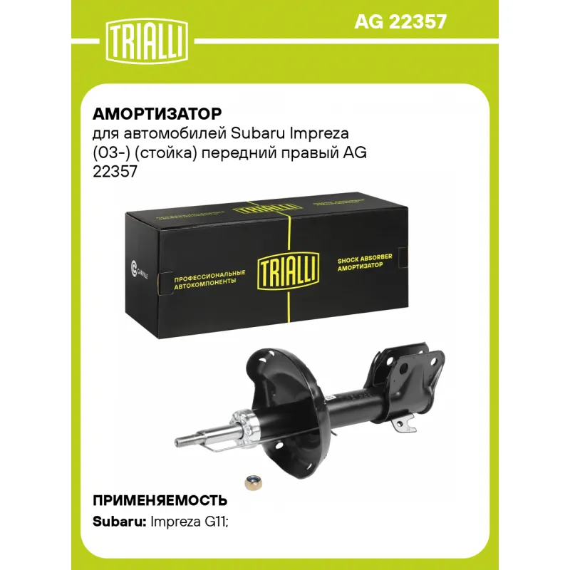 Амортизатор для автомобилей Subaru Impreza (03-) (стойка) передний правый Описание: Амортизатор AG 22357 бренда TRIALLI – это устройство для гашения колебаний (демпфирования) и поглощения толчков и ударов, действующих на раму. Особенности AG 22357: - Вид – Масляный с газовым подпором низкого давления; - Тип – Двухтрубный, гидравлический; Для крепления к деталям кузова или подвески используются крепления: верхнее Шток M14x1.5; и нижнее Скоба. Амортизатор в машину (стойка) имеет специальную площадку для установки пружины подвески. Совместим с: SUBARU IMPREZA.Подбор по VIN-номеру вашего автомобиля - через кнопку 'Задать вопрос'. Специалист проверит применяемость и ответит вам. Преимущества: - Инновационная технология производства; - Контроль качества каждой позиции по чертежам и с помощью 3D модели; - Сальник NOK; - Высокоэффективная система проектирования; - Гарантия до двух лет или 60 000 км пробега; Амортизаторы автомобильные существенно влияют на комфорт вождения, сокращая вибрации от неровностей дороги, что делает поездку более плавной и приятной. Регулярное и своевременное обслуживание амортизаторов помогут продлить их срок службы и обеспечить надёжную работу. Характеристики: Артикул: AG 22357 OEM номера: 20311FE120, 20311FE620, 20311FE640 Товарная линейка: BLACK Парный товар: AG 22156 Количество на автомобиль: 1 Вид амортизатора: Масляный с газовым подпором низкого давления Тип верхнего крепления: Шток Тип нижнего крепления: Скоба Диаметр корпуса, мм: 51 Диаметр штока, мм: 22 Ход штока, мм: 161 Размер резьбы штока: M14x1.5 Тип амортизатора: Двухтрубный, гидравлический Ось (сторона установки): Спереди, справа Присоединительная длина 2, мм: 524 Присоединительная длина 1, мм: 363 Сопутствующий товар: Ремонтные комплекты амортизаторов: BC 1948, BCS 2048 Сопутствующий товар: Амортизаторы: AG 22156, AG 22205, AG 22406 Гарантийный срок: 2 года/60 000 км Подходит для авто: Subaru Impreza G11 (00-) Для проверки применяемости отправьте VIN автомобиля через вкладку "Есть вопросы о товаре?" Комплектация: Амортизатор передний - 1 шт Гайка крепежная - 1 шт Гарантия: от 1 года.