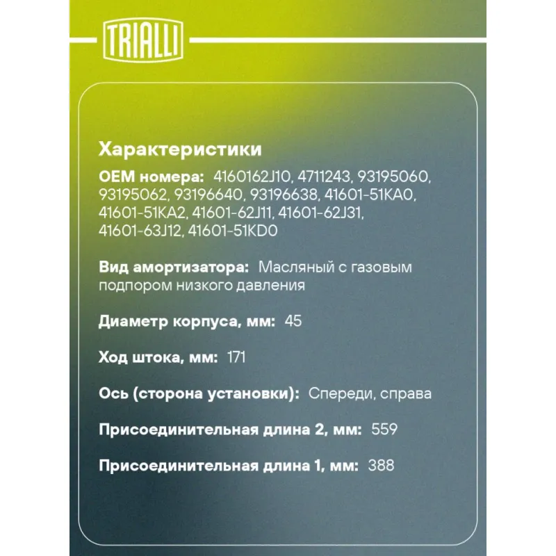 Амортизатор для автомобилей Suzuki Swift (05-) (стойка) передний правый Описание: Амортизатор AG 24360 бренда TRIALLI – это устройство для гашения колебаний (демпфирования) и поглощения толчков и ударов, действующих на раму. Особенности AG 24360: - Вид – Масляный с газовым подпором низкого давления; - Тип – Двухтрубный, гидравлический; Для крепления к деталям кузова или подвески используются крепления: верхнее Шток M12x1.25; и нижнее Скоба. Амортизатор в машину (стойка) имеет специальную площадку для установки пружины подвески. Совместим с: OPEL AGILA, SUZUKI SPLASH, SWIFT.Подбор по VIN-номеру вашего автомобиля - через кнопку 'Задать вопрос'. Специалист проверит применяемость и ответит вам. Преимущества: - Инновационная технология производства; - Контроль качества каждой позиции по чертежам и с помощью 3D модели; - Сальник NOK; - Высокоэффективная система проектирования; - Гарантия до двух лет или 60 000 км пробега; Амортизаторы автомобильные существенно влияют на комфорт вождения, сокращая вибрации от неровностей дороги, что делает поездку более плавной и приятной. Регулярное и своевременное обслуживание амортизаторов помогут продлить их срок службы и обеспечить надёжную работу. Характеристики: Артикул: AG 24360 OEM номера: 4160162J10, 4711243, 93195060, 93195062, 93196640, 93196638, 41601-51KA0, 41601-51KA2, 41601-62J11, 41601-62J31, 41601-63J12, 41601-51KD0, 47 11 005, 47 11 007, 47 09 683, 47 09 685 Товарная линейка: BLACK Парный товар: AG 24159 Количество на автомобиль: 1 Вид амортизатора: Масляный с газовым подпором низкого давления Тип верхнего крепления: Шток Тип нижнего крепления: Скоба Диаметр корпуса, мм: 45 Диаметр штока, мм: 20 Ход штока, мм: 171 Размер резьбы штока: M12x1.25 Тип амортизатора: Двухтрубный, гидравлический Ось (сторона установки): Спереди, справа Присоединительная длина 2, мм: 559 Присоединительная длина 1, мм: 388 Сопутствующий товар: Ремонтные комплекты амортизаторов: BC 1848, BC 1866, BCS 1848, BCS 1866 Сопутствующий товар: Амортизаторы: AG 24159,AG 24506 Гарантийный срок: 2 года/60 000 км Комплектация: Амортизатор передний - 1 шт Гайка крепежная - 1 шт Гарантия: от 1 года.