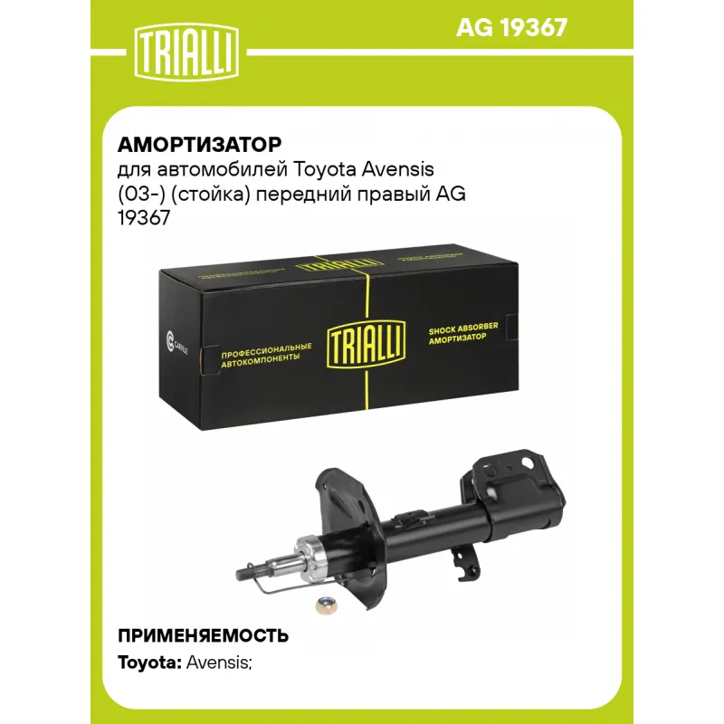 Амортизатор для автомобилей Toyota Avensis (03-) (стойка) передний правый Описание: Амортизатор AG 19367 бренда TRIALLI – это устройство для гашения колебаний (демпфирования) и поглощения толчков и ударов, действующих на раму. Особенности AG 19367: - Вид – Масляный с газовым подпором низкого давления; - Тип – Двухтрубный, гидравлический; Для крепления к деталям кузова или подвески используются крепления: верхнее Шток M14x1.5; и нижнее Скоба. Амортизатор в машину (стойка) имеет специальную площадку для установки пружины подвески. Совместим с: TOYOTA AVENSIS.Подбор по VIN-номеру вашего автомобиля - через кнопку 'Задать вопрос'. Специалист проверит применяемость и ответит вам. Преимущества: - Инновационная технология производства; - Контроль качества каждой позиции по чертежам и с помощью 3D модели; - Сальник NOK; - Высокоэффективная система проектирования; - Гарантия до двух лет или 60 000 км пробега; Амортизаторы автомобильные существенно влияют на комфорт вождения, сокращая вибрации от неровностей дороги, что делает поездку более плавной и приятной. Регулярное и своевременное обслуживание амортизаторов помогут продлить их срок службы и обеспечить надёжную работу. Характеристики: Артикул: AG 19367 OEM номера: 4851005200, 4851005210, 4851005220, 4851005230, 4851009800, 4851009A02, 4851009B20, 4851009N70, 4852005230, 4851009820, 4851009830, 4851009810, 4851009A03, 4851009B40 Товарная линейка: BLACK Парный товар: AG 19166 Количество на автомобиль: 1 Вид амортизатора: Масляный с газовым подпором низкого давления Тип верхнего крепления: Шток Тип нижнего крепления: Скоба Диаметр корпуса, мм: 51 Диаметр штока, мм: 22 Ход штока, мм: 125 Размер резьбы штока: M14x1.5 Тип амортизатора: Двухтрубный, гидравлический Ось (сторона установки): Спереди, справа Дополнительная информация: Упаковка изделия может отличаться от представленной на фото Присоединительная длина 2, мм: 464 Сопутствующий товар: Опоры передних стоек: SA 1957 Присоединительная длина 1, мм: 338 Сопутствующий товар: Ремонтные комплекты амортизаторов: BC 1948, BCS 2048 Сопутствующий товар: Амортизаторы: AG 19166,AG 19512 Гарантийный срок: 2 года/60 000 км Подходит для авто: Toyota Avensis (03-), Avensis (03-), Avensis (03-) Для проверки применяемости отправьте VIN автомобиля через вкладку "Есть вопросы о товаре?" Комплектация: Амортизатор (стойка) передний - 1 шт Гайка крепежная - 1 шт Гарантия: от 1 года.