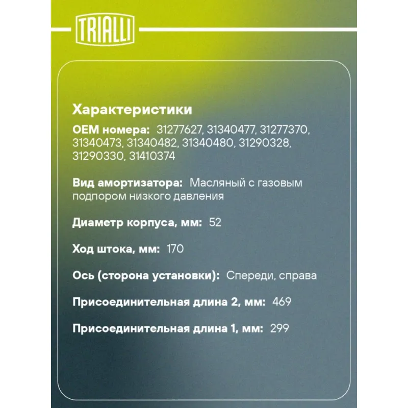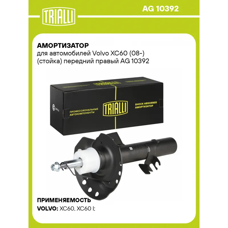 Амортизатор для автомобилей Volvo XC60 (08-) (стойка) передний правый Описание: Амортизатор AG 10392 бренда TRIALLI – это устройство для гашения колебаний (демпфирования) и поглощения толчков и ударов, действующих на раму. Особенности AG 10392: - Вид – Масляный с газовым подпором низкого давления; - Тип – Двухтрубный, гидравлический; Для крепления к деталям кузова или подвески используются крепления: верхнее Шток M12x1,25; и нижнее Зажим. Амортизатор в машину (стойка) имеет специальную площадку для установки пружины подвески. Совместим с: VOLVO XC60.Подбор по VIN-номеру вашего автомобиля - через кнопку 'Задать вопрос'. Специалист проверит применяемость и ответит вам. Преимущества: - Инновационная технология производства; - Контроль качества каждой позиции по чертежам и с помощью 3D модели; - Сальник NOK; - Высокоэффективная система проектирования; - Гарантия до двух лет или 60 000 км пробега; Амортизаторы автомобильные существенно влияют на комфорт вождения, сокращая вибрации от неровностей дороги, что делает поездку более плавной и приятной. Регулярное и своевременное обслуживание амортизаторов помогут продлить их срок службы и обеспечить надёжную работу. Характеристики: Артикул: AG 10392 OEM номера: 31277627, 31340477, 31277370, 31340473, 31340482, 31340480, 31290328, 31290330, 31410374 Товарная линейка: BLACK Парный товар: AG 10191 Количество на автомобиль: 1 Вид амортизатора: Масляный с газовым подпором низкого давления Тип верхнего крепления: Шток Тип нижнего крепления: Зажим Диаметр корпуса, мм: 52 Диаметр штока, мм: 22 Ход штока, мм: 170 Размер резьбы штока: M12x1,25 Тип амортизатора: Двухтрубный, гидравлический Ось (сторона установки): Спереди, справа Дополнительная информация: Упаковка изделия может отличаться от представленной на фото Присоединительная длина 2, мм: 469 Присоединительная длина 1, мм: 299 Сопутствующий товар: Амортизаторы: AG 10191 Гарантийный срок: 2 года/60 000 км Комплектация: Гайка крепежная - 1 шт Амортизатор (стойка) передний - 1 шт Гарантия: от 1 года.