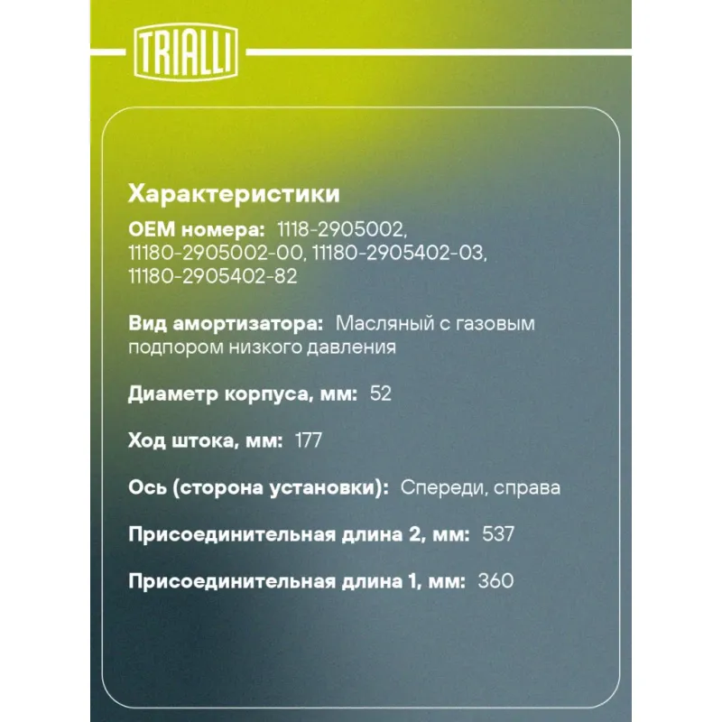 Амортизатор для автомобилей Лада 1118 Kalina (стойка) передний правый газовый Описание: Амортизатор AG 01358 бренда TRIALLI служит для гашения колебаний (демпфирования) и поглощения толчков и ударов, действующих на кузов (раму) автомобиля. Особенности AG 01358: - Вид амортизатора – Масляный с газовым подпором низкого давления; - Тип амортизатора – Двухтрубный, гидравлический; Для крепления к деталям кузова автомобиля или подвески используется - верхнее крепление Шток M14x1.5; и нижнее крепление - Скоба. Амортизатор в машину (стойка) отличается от обычного амортизатора наличием специальной площадки для установки пружины подвески. Применяемость: LADA KALINA..Подбор по VIN-номеру вашего автомобиля - через кнопку 'Задать вопрос'. Специалист проверит применяемость и ответит вам. Преимущества: - Инновационная технология производства; - Контроль качества: - Дополнительная проверка с помощью 3D модели; - Сальник NOK; - Проверка каждой позиции по чертежам; - Высокоэффективная система проектирования; Амортизаторы автомобильные существенно влияют на комфорт вождения, поглощая удары и вибрации от неровностей дороги, что делает поездку более плавной и приятной.Регулярная проверка и своевременное обслуживание амортизаторов помогут продлить их срок службы и обеспечить надёжную работу. Характеристики: Артикул: AG 01358 OEM номера: 1118-2905002, 11180-2905002-00, 11180-2905402-03, 11180-2905402-82 Товарная линейка: PRO Парный товар: AG 01157 Количество на автомобиль: 1 Вид амортизатора: Масляный с газовым подпором низкого давления Тип верхнего крепления: Шток Тип нижнего крепления: Скоба Диаметр корпуса, мм: 52 Диаметр штока, мм: 22 Ход штока, мм: 177 Размер резьбы штока: M14x1.5 Тип амортизатора: Двухтрубный, гидравлический Ось (сторона установки): Спереди, справа Дополнительная информация: Для а/м с коническими пружинами Присоединительная длина 2, мм: 537 Сопутствующий товар: Опоры передних стоек: SA 504 Присоединительная длина 1, мм: 360 Сопутствующий товар: Ремонтные комплекты амортизаторов: BC 0103, BC 0133, BCS 0103, BCS 0136, BC 1966, BCS 2066,BC 0184, BC 0154, BCS 0106, BCS 0133 Сопутствующий товар: Амортизаторы: AH 01358, AG 01157,AG 01356, AH 01356, AG 01504, AH 01155, AH 01157, AH 01504, AG 01155 Гарантийный срок: 2 года/60 000 км Подходит для авто: ВАЗ Kalina (04-), Kalina (04-), Kalina (04-) Для проверки применяемости отправьте VIN автомобиля через вкладку "Есть вопросы о товаре?" Комплектация: Амортизатор (стойка) передний - 1 шт Гайка крепежная - 1 шт Гарантия: от 1 года.