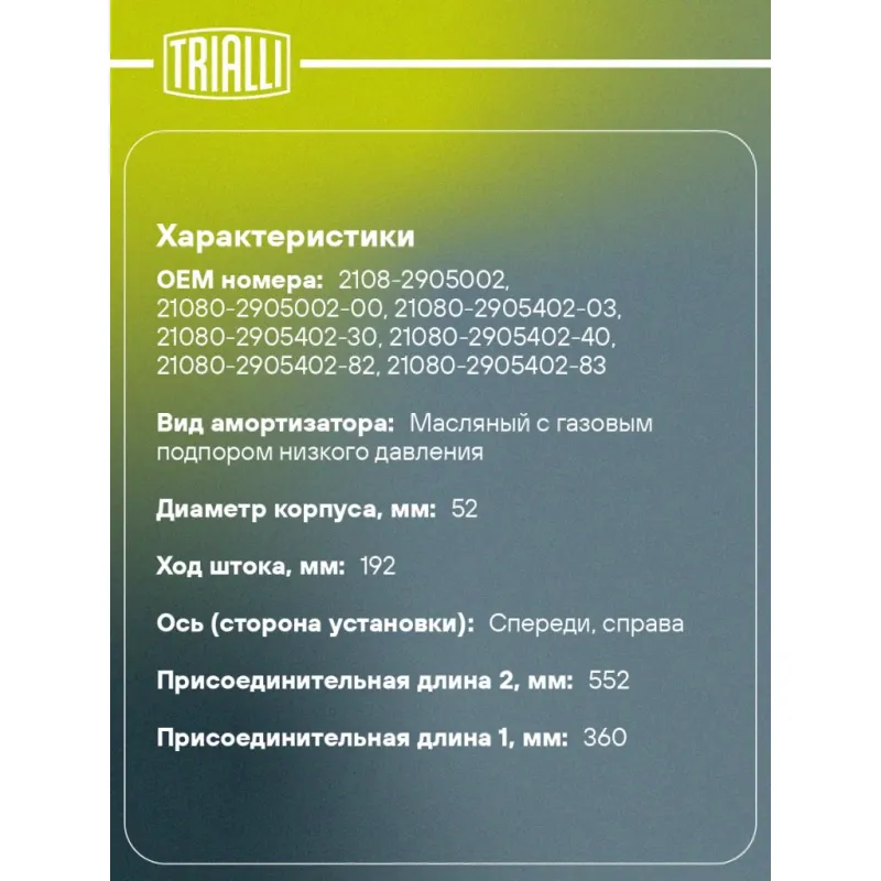 Амортизатор для автомобилей Лада 2108 (стойка) передний правый газовый Описание: Амортизатор AG 01352 бренда TRIALLI служит для гашения колебаний (демпфирования) и поглощения толчков и ударов, действующих на кузов (раму) автомобиля. Особенности AG 01352: - Вид амортизатора – Масляный с газовым подпором низкого давления; - Тип амортизатора – Двухтрубный, гидравлический; Для крепления к деталям кузова автомобиля или подвески используется - верхнее крепление Шток M14x1.5; и нижнее крепление - Скоба. Амортизатор в машину (стойка) отличается от обычного амортизатора наличием специальной площадки для установки пружины подвески. Применяемость: LADA SAMARA..Подбор по VIN-номеру вашего автомобиля - через кнопку 'Задать вопрос'. Специалист проверит применяемость и ответит вам. Преимущества: - Инновационная технология производства; - Контроль качества: - Дополнительная проверка с помощью 3D модели; - Сальник NOK; - Проверка каждой позиции по чертежам; - Высокоэффективная система проектирования; Амортизаторы автомобильные существенно влияют на комфорт вождения, поглощая удары и вибрации от неровностей дороги, что делает поездку более плавной и приятной.Регулярная проверка и своевременное обслуживание амортизаторов помогут продлить их срок службы и обеспечить надёжную работу. Характеристики: Артикул: AG 01352 OEM номера: 2108-2905002, 21080-2905002-00, 21080-2905402-03, 21080-2905402-30, 21080-2905402-40, 21080-2905402-82, 21080-2905402-83 Товарная линейка: PRO Парный товар: AG 01151 Количество на автомобиль: 1 Вид амортизатора: Масляный с газовым подпором низкого давления Тип верхнего крепления: Шток Тип нижнего крепления: Скоба Диаметр корпуса, мм: 52 Диаметр штока, мм: 22 Ход штока, мм: 192 Размер резьбы штока: M14x1.5 Тип амортизатора: Двухтрубный, гидравлический Ось (сторона установки): Спереди, справа Дополнительная информация: Упаковка изделия может отличаться от представленной на фото Присоединительная длина 2, мм: 552 Сопутствующий товар: Опоры передних стоек: SA 0151 Присоединительная длина 1, мм: 360 Сопутствующий товар: Ремонтные комплекты амортизаторов: BC 0101, BC 0131, BC 0110, BC 1966, BCS 2066,BC 0181, BC 0151 Сопутствующий товар: Амортизаторы: AH 01352, AG 01151,AH 01090, AH 01503, AH 01151, AG 01176, AG 01377, AH 01377, AH 01176, AG 01503, AG 01090 Гарантийный срок: 2 года/60 000 км Подходит для авто: ВАЗ 2108, 2109, 21099, 2113, 2114, 2115, 2108, 2109, 2113, 2114, 2115 Для проверки применяемости отправьте VIN автомобиля через вкладку "Есть вопросы о товаре?" Комплектация: Амортизатор (стойка) передний - 1 шт Гайка крепежная - 1 шт Гарантия: от 1 года.