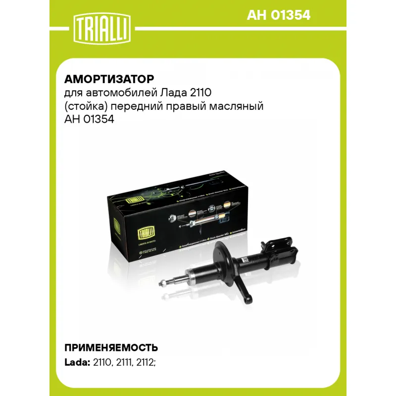 Амортизатор для автомобилей Лада 2110 (стойка) передний правый масляный Описание: Амортизатор AH 01354 бренда TRIALLI служит для гашения колебаний (демпфирования) и поглощения толчков и ударов, действующих на кузов (раму) автомобиля. Особенности AH 01354: - Вид амортизатора – Масляный; - Тип амортизатора – Двухтрубный, гидравлический; Для крепления к деталям кузова автомобиля или подвески используется - верхнее крепление Шток M14x1.5; и нижнее крепление - Скоба. Амортизатор в машину (стойка) отличается от обычного амортизатора наличием специальной площадки для установки пружины подвески. Применяемость: LADA ВАЗ 2110-2112..Подбор по VIN-номеру вашего автомобиля - через кнопку 'Задать вопрос'. Специалист проверит применяемость и ответит вам. Преимущества: - Инновационная технология производства; - Контроль качества: - Дополнительная проверка с помощью 3D модели; - Сальник NOK; - Проверка каждой позиции по чертежам; - Высокоэффективная система проектирования; Амортизаторы автомобильные существенно влияют на комфорт вождения, поглощая удары и вибрации от неровностей дороги, что делает поездку более плавной и приятной.Регулярная проверка и своевременное обслуживание амортизаторов помогут продлить их срок службы и обеспечить надёжную работу. Характеристики: Артикул: AH 01354 OEM номера: 2110-2905002, 21100-2905002-00 Товарная линейка: BLACK Парный товар: AH 01153 Количество на автомобиль: 1 Вид амортизатора: Масляный Тип верхнего крепления: Шток Тип нижнего крепления: Скоба Диаметр корпуса, мм: 52 Диаметр штока, мм: 22 Ход штока, мм: 167 Размер резьбы штока: M14x1.5 Тип амортизатора: Двухтрубный, гидравлический Ось (сторона установки): Спереди, справа Дополнительная информация: Упаковка изделия может отличаться от представленной на фото Присоединительная длина 2, мм: 530 Сопутствующий товар: Опоры передних стоек: SA 0152 Присоединительная длина 1, мм: 363 Сопутствующий товар: Ремонтные комплекты амортизаторов: BC 0102, BC 0132, BC 0110, BCS 0102, BCS 0132, BC 1948, BCS 2048,BC 0152, BC 0182 Сопутствующий товар: Амортизаторы: AG 01354, AH 01153,AH 01091, AG 01091, AH 01504, AG 01504, AG 01178, AH 01178, AG 01379, AH 01379, AG 01153 Гарантийный срок: 2 года/60 000 км Подходит для авто: ВАЗ 2110, 2110, 2111, 2112, 2110, 2111, 2112 Для проверки применяемости отправьте VIN автомобиля через вкладку "Есть вопросы о товаре?" Комплектация: Амортизатор (стойка) передний - 1 шт Гайка крепежная - 1 шт Гарантия: от 1 года.