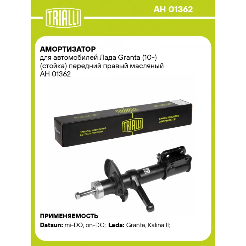 Амортизатор для автомобилей Лада Granta (10-) (стойка) передний правый масляный Описание: Амортизатор AH 01362 бренда TRIALLI служит для гашения колебаний (демпфирования) и поглощения толчков и ударов, действующих на кузов (раму) автомобиля. Особенности AH 01362: - Вид амортизатора – Масляный; - Тип амортизатора – Двухтрубный, гидравлический; Для крепления к деталям кузова автомобиля или подвески используется - верхнее крепление Шток M14x1.5; и нижнее крепление - Скоба. Амортизатор в машину (стойка) отличается от обычного амортизатора наличием специальной площадки для установки пружины подвески. Применяемость: DATSUN on-DO, mi-DO, LADA GRANTA, KALINA..Подбор по VIN-номеру вашего автомобиля - через кнопку 'Задать вопрос'. Специалист проверит применяемость и ответит вам. Преимущества: - Инновационная технология производства; - Контроль качества: - Дополнительная проверка с помощью 3D модели; - Сальник NOK; - Проверка каждой позиции по чертежам; - Высокоэффективная система проектирования; Амортизаторы автомобильные существенно влияют на комфорт вождения, поглощая удары и вибрации от неровностей дороги, что делает поездку более плавной и приятной.Регулярная проверка и своевременное обслуживание амортизаторов помогут продлить их срок службы и обеспечить надёжную работу. Характеристики: Артикул: AH 01362 OEM номера: 2190-2905002, 54302-5PA1C, 21900-2905002-00 Товарная линейка: BLACK Парный товар: AH 01161 Количество на автомобиль: 1 Вид амортизатора: Масляный Тип верхнего крепления: Шток Тип нижнего крепления: Скоба Диаметр корпуса, мм: 52 Диаметр штока, мм: 22 Ход штока, мм: 171 Размер резьбы штока: M14x1.5 Тип амортизатора: Двухтрубный, гидравлический Ось (сторона установки): Спереди, справа Дополнительная информация: Упаковка изделия может отличаться от представленной на фото Присоединительная длина 2, мм: 514 Сопутствующий товар: Опоры передних стоек: SA 0155, SA 0156 Присоединительная длина 1, мм: 343 Сопутствующий товар: Ремонтные комплекты амортизаторов: BC 0102, BC 0132, BC 0110, BCS 0102, BCS 0132, BC 1948, BC 1966, BCS 2066,BCS 0103, BC 0154, BC 0157, BC 0187 Сопутствующий товар: Амортизаторы: AG 01362, AH 01161,AG 01369, AG 01517, AG 01161, AG 01168, AG 01510, AH 01510 Гарантийный срок: 2 года/60 000 км Подходит для авто: Datsun mi-DO (15-), on-DO (14-) ВАЗ Granta (10-), Kalina II (13-) Для проверки применяемости отправьте VIN автомобиля через вкладку "Есть вопросы о товаре?" Комплектация: Амортизатор (стойка) передний - 1 шт Гайка крепежная - 1 шт Гарантия: от 1 года.