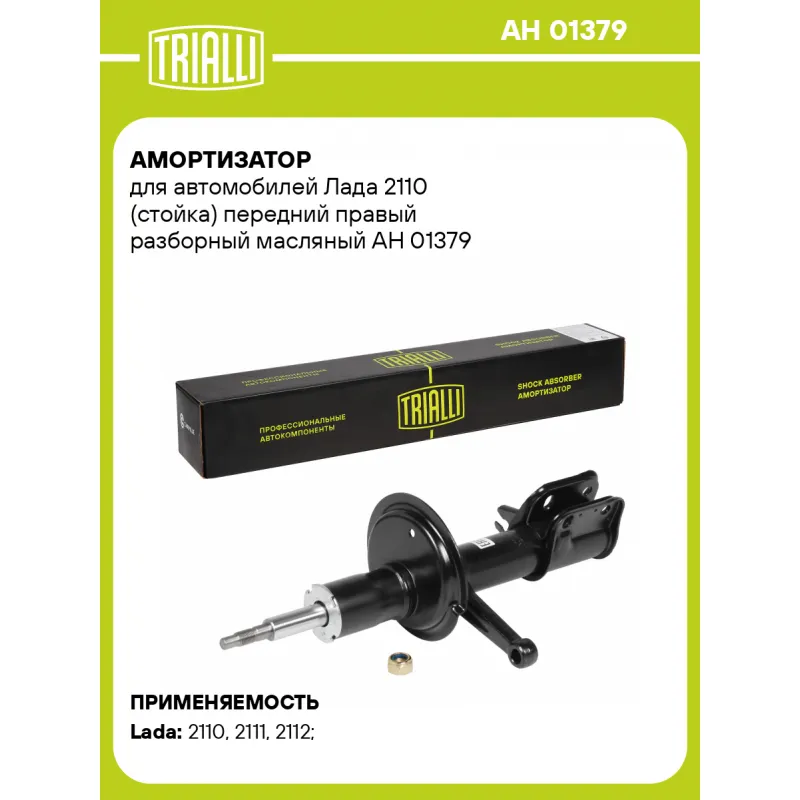 Амортизатор для автомобилей Лада 2110 (стойка) передний правый разборный масляный Описание: Амортизатор AH 01379 бренда TRIALLI – это устройство для гашения колебаний (демпфирования) и поглощения толчков и ударов, действующих на раму. Особенности AH 01379: - Вид – Масляный; - Тип – Двухтрубный, гидравлический; Для крепления к деталям кузова или подвески используются крепления: верхнее Шток M14x1.5; и нижнее Скоба. Амортизатор в машину (стойка) имеет специальную площадку для установки пружины подвески. Совместим с: LADA ВАЗ 2110-2112.Подбор по VIN-номеру вашего автомобиля - через кнопку 'Задать вопрос'. Специалист проверит применяемость и ответит вам. Преимущества: - Инновационная технология производства; - Контроль качества каждой позиции по чертежам и с помощью 3D модели; - Сальник NOK; - Высокоэффективная система проектирования; - Гарантия до двух лет или 60 000 км пробега; Амортизаторы автомобильные существенно влияют на комфорт вождения, сокращая вибрации от неровностей дороги, что делает поездку более плавной и приятной. Регулярное и своевременное обслуживание амортизаторов помогут продлить их срок службы и обеспечить надёжную работу. Характеристики: Артикул: AH 01379 OEM номера: 2110-2905002, 21100-2905002-00 Товарная линейка: BLACK Парный товар: AH 01178 Количество на автомобиль: 1 Вид амортизатора: Масляный Тип верхнего крепления: Шток Тип нижнего крепления: Скоба Диаметр корпуса, мм: 52 Диаметр штока, мм: 22 Ход штока, мм: 167 Размер резьбы штока: M14x1.5 Тип амортизатора: Двухтрубный, гидравлический Ось (сторона установки): Спереди, справа Дополнительная информация: Разборная стойка Присоединительная длина 2, мм: 530 Сопутствующий товар: Опоры передних стоек: SA 0152 Присоединительная длина 1, мм: 363 Сопутствующий товар: Ремонтные комплекты амортизаторов: BC 0102, BC 0132, BC 0110, BCS 0102, BCS 0132, BC 1948, BCS 2048,BC 0152, BC 0182 Сопутствующий товар: Амортизаторы: AG 01379, AH 01178,AH 01354, AH 01091, AG 01091, AH 01504, AH 01153, AG 01178, AG 01504, AG 01354, AG 01153 Гарантийный срок: 2 года/60 000 км Подходит для авто: ВАЗ 2110, 2110, 2111, 2112, 2110, 2111, 2112 Для проверки применяемости отправьте VIN автомобиля через вкладку "Есть вопросы о товаре?" Комплектация: Гайка крепежная - 1 шт Амортизатор (стойка) передний - 1 шт Гарантия: от 1 года.