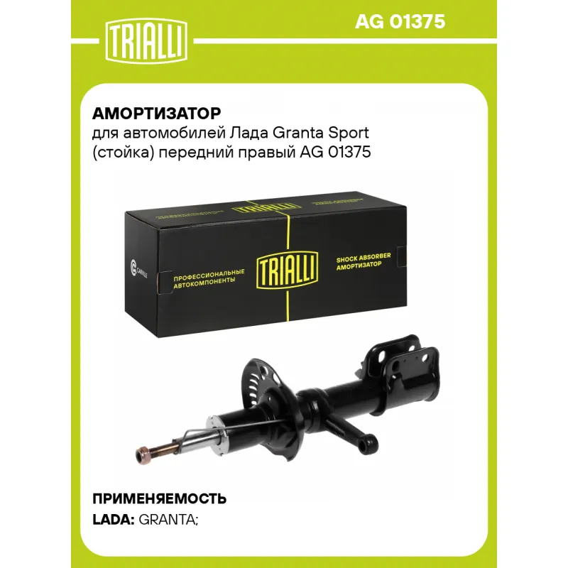 Амортизатор для автомобилей Лада Granta Sport (стойка) передний правый Описание: Амортизатор AG 01375 бренда TRIALLI – это устройство для гашения колебаний (демпфирования) и поглощения толчков и ударов, действующих на раму. Особенности AG 01375: - Вид – Масляный с газовым подпором низкого давления; - Тип – Двухтрубный, гидравлический; Для крепления к деталям кузова или подвески используются крепления: верхнее Шток M14x1,5; и нижнее Скоба. Амортизатор в машину (стойка) имеет специальную площадку для установки пружины подвески. Совместим с: LADA GRANTA.Подбор по VIN-номеру вашего автомобиля - через кнопку 'Задать вопрос'. Специалист проверит применяемость и ответит вам. Преимущества: - Инновационная технология производства; - Контроль качества каждой позиции по чертежам и с помощью 3D модели; - Сальник NOK; - Высокоэффективная система проектирования; - Гарантия до двух лет или 60 000 км пробега; Амортизаторы автомобильные существенно влияют на комфорт вождения, сокращая вибрации от неровностей дороги, что делает поездку более плавной и приятной. Регулярное и своевременное обслуживание амортизаторов помогут продлить их срок службы и обеспечить надёжную работу. Характеристики: Артикул: AG 01375 OEM номера: 21905-2905002-89, 8450104703 Товарная линейка: BLACK Парный товар: AG 01174 Количество на автомобиль: 1 Вид амортизатора: Масляный с газовым подпором низкого давления Тип верхнего крепления: Шток Тип нижнего крепления: Скоба Диаметр корпуса, мм: 51 Диаметр штока, мм: 22 Ход штока, мм: 161 Размер резьбы штока: M14x1,5 Тип амортизатора: Двухтрубный, гидравлический Ось (сторона установки): Спереди, справа Присоединительная длина 2, мм: 505 Сопутствующий товар: Опоры передних стоек: SA 0155; SA 0156 Присоединительная длина 1, мм: 344 Сопутствующий товар: Ремонтные комплекты амортизаторов: BC 1948, BCS 2048,BC 0154, BCS 0132, BC 0187, BCS 0103, BC 0102, BC 0157, BC 0132 Сопутствующий товар: Амортизаторы: AG 01174,AG 01520 Гарантийный срок: 2 года/60 000 км Комплектация: Гайка крепежная - 1 шт Амортизатор (стойка) передний - 1 шт Гарантия: от 1 года.