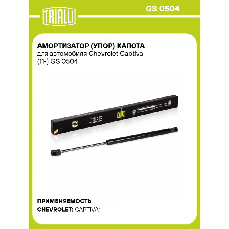 Амортизатор (упор) капота для автомобиля Chevrolet Captiva (11-) Характеристики: Артикул: GS 0504 OEM номера: 95494362, 95494361, 22739360 Товарная линейка: BLACK Количество на автомобиль: 2 Гарантийный срок: 2 года / 60 000 км Длина в свободном состоянии: 435 Длина в сжатом состоянии: 279 Ход поршня: 156 Усилие в точке P3: 300 Комплектация: Амортизатор (упор) капота - 1 шт Гарантия: от 1 года.