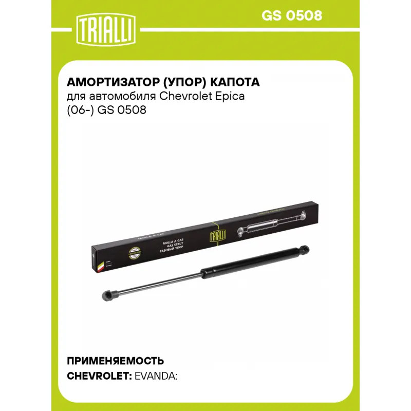 Амортизатор (упор) капота для автомобиля Chevrolet Epica (06-) Характеристики: Артикул: GS 0508 OEM номера: 96636673, 95017985, 96636411 Товарная линейка: BLACK Количество на автомобиль: 2 Гарантийный срок: 2 года / 60 000 км Длина в свободном состоянии: 418 Длина в сжатом состоянии: 251 Ход поршня: 167 Усилие в точке P3: 310 Комплектация: Амортизатор (упор) капота - 1 шт Гарантия: от 1 года.