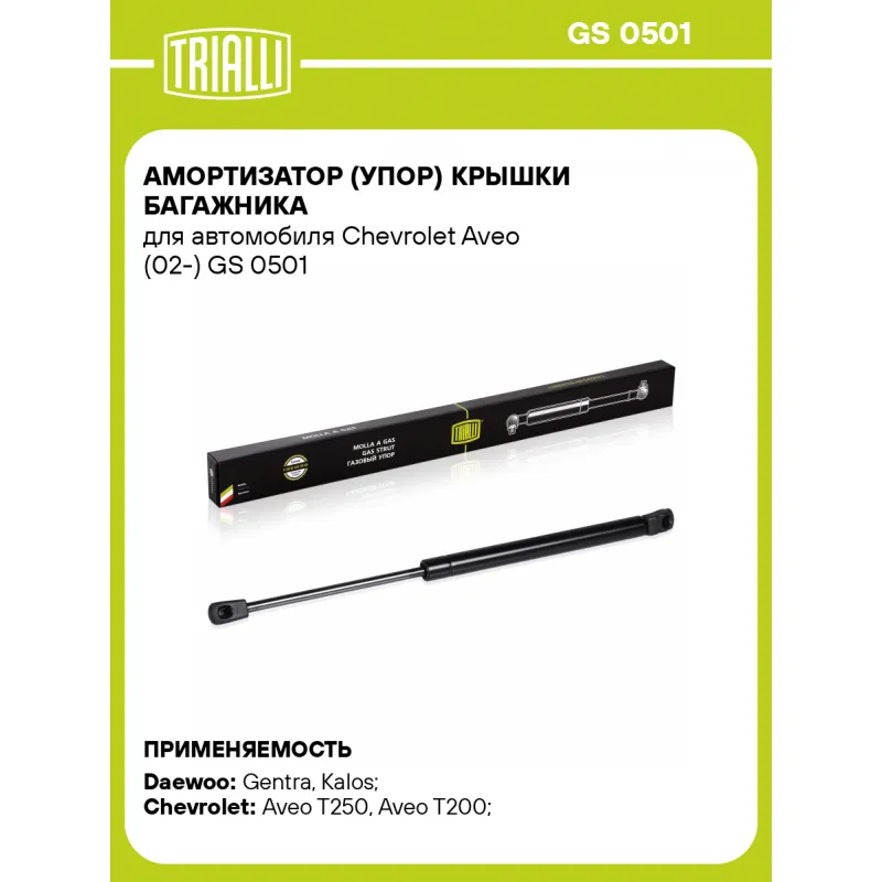 Амортизатор (упор) крышки багажника для автомобиля Chevrolet Aveo (02-) Характеристики: Артикул: GS 0501 OEM номера: 96540939 Товарная линейка: BLACK Количество на автомобиль: 2 Гарантийный срок: 2 года / 60 000 км Длина в свободном состоянии: 389 Длина в сжатом состоянии: 239 Ход поршня: 150 Усилие в точке P3: 350 Подходит для авто: Daewoo Gentra (05-), Kalos (02-) Chevrolet Aveo T250 (06-), Aveo T200 (02-) Для проверки применяемости отправьте VIN автомобиля через вкладку "Есть вопросы о товаре?" Комплектация: Амортизатор (упор) крышки багажника - 1 шт Гарантия: от 1 года.
