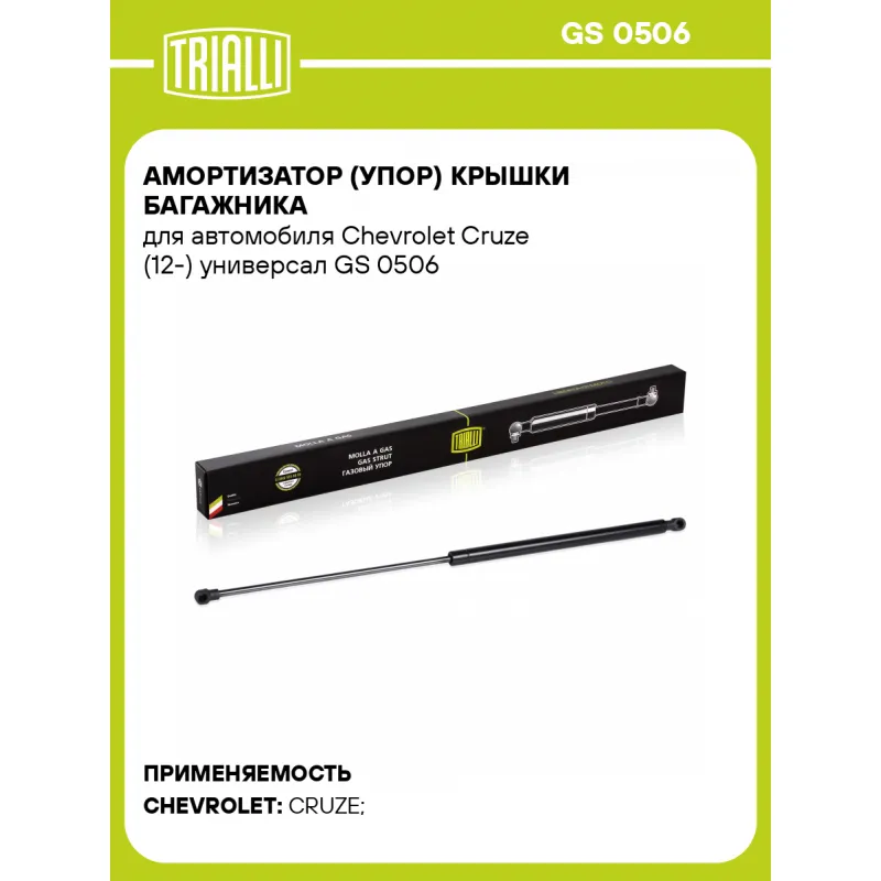 Амортизатор (упор) крышки багажника для автомобиля Chevrolet Cruze (12-) универсал Характеристики: Артикул: GS 0506 OEM номера: 95146515 Товарная линейка: BLACK Количество на автомобиль: 2 Гарантийный срок: 2 года / 60 000 км Длина в свободном состоянии: 611 Длина в сжатом состоянии: 329 Ход поршня: 282 Усилие в точке P3: 478 Комплектация: Амортизатор (упор) крышки багажника - 1 шт Гарантия: от 1 года.