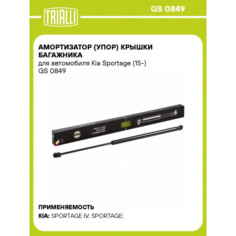 Амортизатор (упор) крышки багажника для автомобиля Kia Sportage (15-) Характеристики: Артикул: GS 0849 OEM номера: 81770-D9000, 81770-F1000, 81780-D9000, 81780-F1000 Товарная линейка: BLACK Количество на автомобиль: 2 Гарантийный срок: 2 года / 60 000 км Длина в свободном состоянии: 546 Длина в сжатом состоянии: 336 Ход поршня: 210 Усилие в точке P3: 600 Комплектация: Амортизатор (упор) крышки багажника - 1 шт Гарантия: от 1 года.