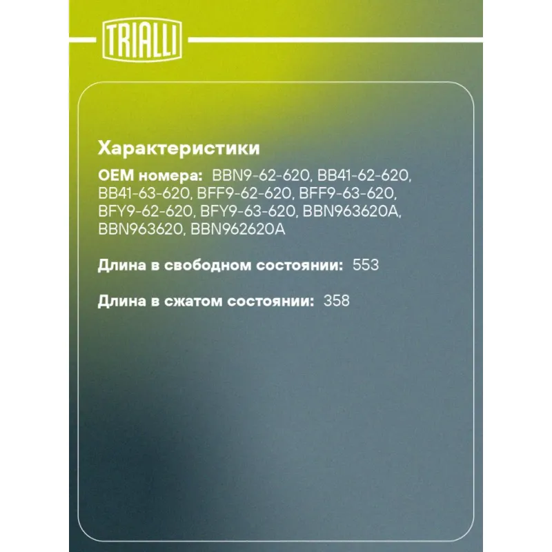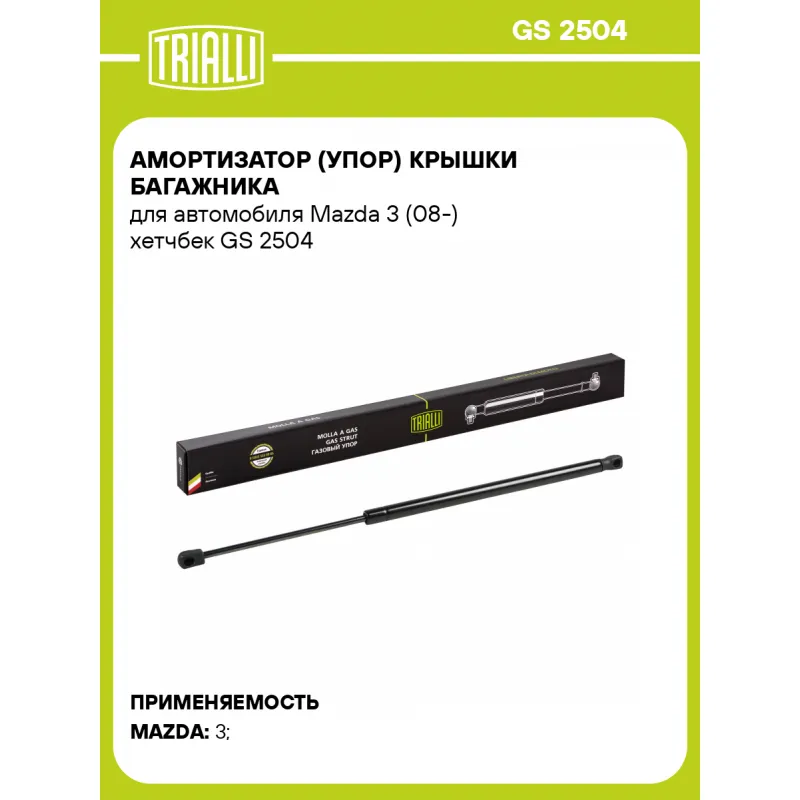 Амортизатор (упор) крышки багажника для автомобиля Mazda 3 (08-) хетчбек Характеристики: Артикул: GS 2504 OEM номера: BBN9-62-620, BBN9-62-620A, BBN9-63-620, BBN9-63-620A, BB41-62-620, BB41-63-620, BFF9-62-620, BFF9-63-620, BFY9-62-620, BFY9-63-620 Товарная линейка: BLACK Количество на автомобиль: 2 Гарантийный срок: 2 года / 60 000 км Длина в свободном состоянии: 553 Длина в сжатом состоянии: 358 Ход поршня: 195 Усилие в точке P3: 400 Комплектация: Амортизатор (упор) крышки багажника - 1 шт Гарантия: от 1 года.
