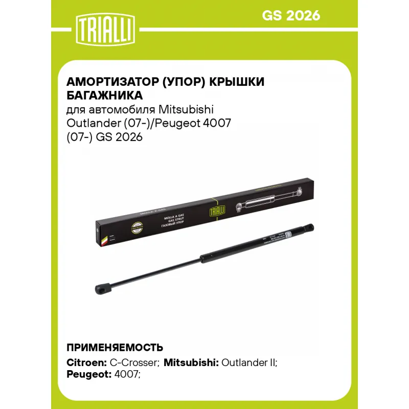 Амортизатор (упор) крышки багажника для автомобиля Mitsubishi Outlander (07-)/Peugeot 4007 (07-) Характеристики: Артикул: GS 2026 OEM номера: 8731 Q1, 5802A007, 1617189480, 8731 Q2, 5802A008, 1617189580 Товарная линейка: BLACK Количество на автомобиль: 2 Гарантийный срок: 2 года / 60 000 км Длина в свободном состоянии: 495 Длина в сжатом состоянии: 299 Ход поршня: 196 Усилие в точке P3: 420 Подходит для авто: Citroen C-Crosser (07-), C-Crosser (07-) Mitsubishi Outlander II (06-) Peugeot 4007 (07-) Для проверки применяемости отправьте VIN автомобиля через вкладку "Есть вопросы о товаре?" Комплектация: Амортизатор (упор) крышки багажника - 1 шт Гарантия: от 1 года.
