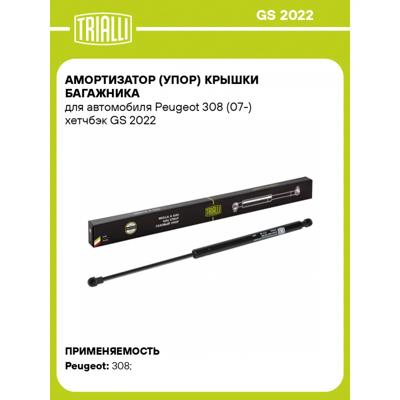Амортизатор (упор) крышки багажника для автомобиля Peugeot 308 (07-) хетчбэк Характеристики: Артикул: GS 2022 OEM номера: 8731 Q6 Товарная линейка: BLACK Количество на автомобиль: 2 Гарантийный срок: 2 года / 60 000 км Длина в свободном состоянии: 455 Длина в сжатом состоянии: 270 Ход поршня: 185 Усилие в точке P3: 440 Подходит для авто: Peugeot 308 (07-), 308 (07-), 308 (07-) Для проверки применяемости отправьте VIN автомобиля через вкладку "Есть вопросы о товаре?" Комплектация: Амортизатор (упор) крышки багажника - 1 шт Гарантия: от 1 года.