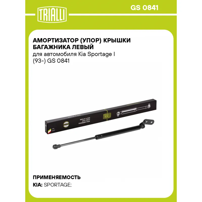 Амортизатор (упор) крышки багажника левый для автомобиля Kia Sportage I (93-) Характеристики: Артикул: GS 0841 OEM номера: 0K01H63610F, 0K01H63610E, 0K01H63610D, 0K01H63610C, 0K01H63610B, 0K01H63610A, 0K01G63610F, 0K01G63610E, 0K01G63610D, 0K01G63610C, 0K01G63610B, 0K01G63610A Товарная линейка: BLACK Парный товар: GS 0842 Количество на автомобиль: 2 Гарантийный срок: 2 года / 60 000 км Длина в свободном состоянии: 411 Длина в сжатом состоянии: 254 Ход поршня: 157 Усилие в точке P3: 540 Комплектация: Амортизатор (упор) крышки багажника - 1 шт Гарантия: от 1 года.