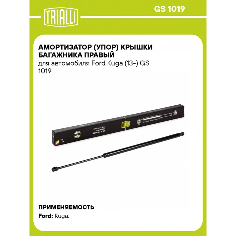 Амортизатор (упор) крышки багажника правый для автомобиля Ford Kuga (13-) Характеристики: Артикул: GS 1019 OEM номера: CV44S406A10AB, 1790926, 1945552 Товарная линейка: BLACK Парный товар: GS 1018 Количество на автомобиль: 2 Гарантийный срок: 2 года / 60 000 км Длина в свободном состоянии: 743 Длина в сжатом состоянии: 506 Ход поршня: 237 Усилие в точке P3: 670 Подходит для авто: Ford Kuga (13-) Для проверки применяемости отправьте VIN автомобиля через вкладку "Есть вопросы о товаре?" Комплектация: Амортизатор (упор) крышки багажника - 1 шт Гарантия: от 1 года.