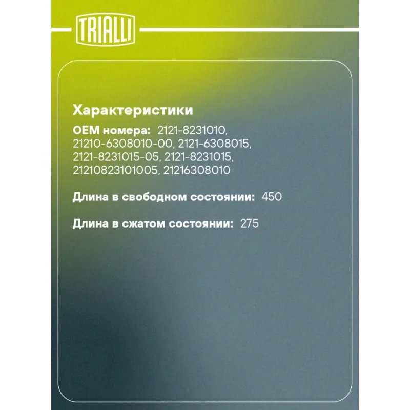 Амортизатор (упор) задней двери для автомобиля Лада 2104/2121 Характеристики: Артикул: GS 0101 OEM номера: 21210-8231010-05, 2121-8231010, 2121-6308010, 21210-6308010-00, 2121-6308015, 2121-8231015-05, 2121-8231015 Товарная линейка: BLACK Количество на автомобиль: 2 Гарантийный срок: 2 года / 60 000 км Длина в свободном состоянии: 450 Длина в сжатом состоянии: 275 Ход поршня: 175 Усилие в точке P3: 280 Подходит для авто: ВАЗ 2104, 2104, 2121, 2131, 21213, 2110, 2110, 2111, 2112, 2104, 2121, 2131, 2131, 21213, 21214 Для проверки применяемости отправьте VIN автомобиля через вкладку "Есть вопросы о товаре?" Комплектация: Амортизатор (упор) задней двери - 1 шт Гарантия: от 1 года.