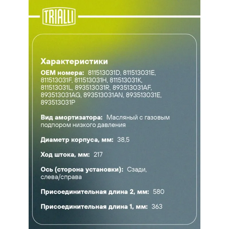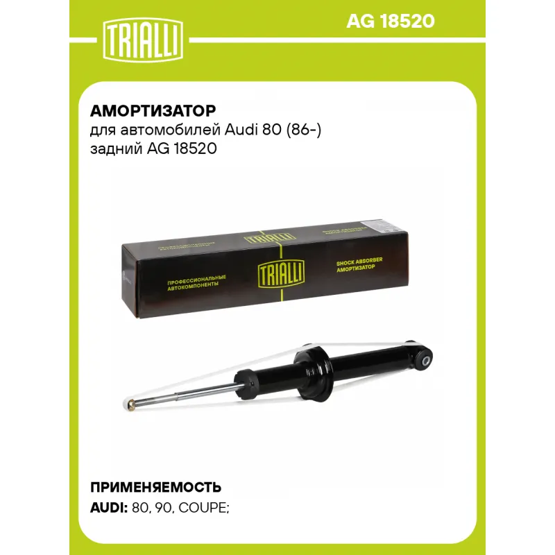 Амортизатор для автомобилей Audi 80 (86-) задний Описание: Амортизатор AG 18520 бренда TRIALLI – это устройство для гашения колебаний (демпфирования) и поглощения толчков и ударов, действующих на раму. Особенности AG 18520: - Вид – Масляный с газовым подпором низкого давления; - Тип – Двухтрубный, гидравлический; Для крепления к деталям кузова или подвески используются крепления: верхнее Шток M10x1; и нижнее Проушина/сайлентблок. Совместим с: AUDI 80, 90, COUPE.Подбор по VIN-номеру вашего автомобиля - через кнопку 'Задать вопрос'. Специалист проверит применяемость и ответит вам. Преимущества: - Инновационная технология производства; - Контроль качества каждой позиции по чертежам и с помощью 3D модели; - Сальник NOK; - Высокоэффективная система проектирования; - Гарантия до двух лет или 60 000 км пробега; Амортизаторы автомобильные существенно влияют на комфорт вождения, сокращая вибрации от неровностей дороги, что делает поездку более плавной и приятной. Регулярное и своевременное обслуживание амортизаторов помогут продлить их срок службы и обеспечить надёжную работу. Характеристики: Артикул: AG 18520 OEM номера: 811513031D, 811513031E, 811513031F, 811513031H, 811513031K, 811513031L, 893513031R, 893513031AF, 893513031AG, 893513031AN, 893513031E, 893513031P, 893513031Q, 811513031M, 811513031N, 811513031P, 811513031Q, 811513031R, 893513031 Товарная линейка: BLACK Количество на автомобиль: 2 Вид амортизатора: Масляный с газовым подпором низкого давления Тип верхнего крепления: Шток Тип нижнего крепления: Проушина/сайлентблок Диаметр корпуса, мм: 38.5 Диаметр штока, мм: 12.5 Ход штока, мм: 217 Размер резьбы штока: M10x1 Тип амортизатора: Двухтрубный, гидравлический Ось (сторона установки): Сзади, слева/справа Дополнительная информация: Упаковка изделия может отличаться от представленной на фото Присоединительная длина 2, мм: 580 Присоединительная длина 1, мм: 363 Гарантийный срок: 2 года/60 000 км Комплектация: Гайка крепежная - 1 шт Амортизатор задний - 1 шт Гарантия: от 1 года.