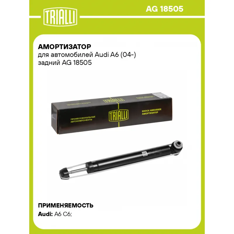 Амортизатор для автомобилей Audi A6 (04-) задний Описание: Амортизатор AG 18505 бренда TRIALLI – это устройство для гашения колебаний (демпфирования) и поглощения толчков и ударов, действующих на раму. Особенности AG 18505: - Вид – Масляный с газовым подпором низкого давления ; - Тип – Двухтрубный, гидравлический; Для крепления к деталям кузова или подвески используются крепления: верхнее Шток M10x1.0; и нижнее Проушина/сайлентблок. Совместим с: AUDI A6, SEAT LEON, SKODA OCTAVIA.Подбор по VIN-номеру вашего автомобиля - через кнопку 'Задать вопрос'. Специалист проверит применяемость и ответит вам. Преимущества: - Инновационная технология производства; - Контроль качества каждой позиции по чертежам и с помощью 3D модели; - Сальник NOK; - Высокоэффективная система проектирования; - Гарантия до двух лет или 60 000 км пробега; Амортизаторы автомобильные существенно влияют на комфорт вождения, сокращая вибрации от неровностей дороги, что делает поездку более плавной и приятной. Регулярное и своевременное обслуживание амортизаторов помогут продлить их срок службы и обеспечить надёжную работу. Характеристики: Артикул: AG 18505 OEM номера: 4F0513031R, 4F0513032AD, 4F0513032AE, 4F0513032H, 4F0513032J Товарная линейка: BLACK Количество на автомобиль: 2 Вид амортизатора: Масляный с газовым подпором низкого давления Тип верхнего крепления: Шток Тип нижнего крепления: Проушина/сайлентблок Диаметр корпуса, мм: 51 Диаметр штока, мм: 12,5 Ход штока, мм: 206 Размер резьбы штока: M10x1.0 Тип амортизатора: Двухтрубный, гидравлический Ось (сторона установки): Сзади, слева/справа Дополнительная информация: Упаковка изделия может отличаться от представленной на фото Присоединительная длина 2, мм: 630 Присоединительная длина 1, мм: 424 Сопутствующий товар: Ремонтные комплекты амортизаторов: BCS 1084 Сопутствующий товар: Амортизаторы: AG 18054; AG 18060; AG 18065; AG 18515, AG 18076 Гарантийный срок: 2 года/60 000 км Подходит для авто: Audi A6 C6 (04-) Для проверки применяемости отправьте VIN автомобиля через вкладку "Есть вопросы о товаре?" Комплектация: Амортизатор задний - 1 шт Шарнир резинометаллический - 1 шт Гайка крепежная - 1 шт Гарантия: от 1 года.