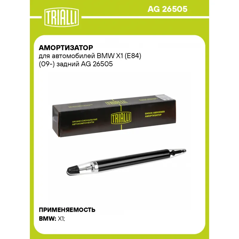 Амортизатор для автомобилей BMW X1 (E84) (09-) задний Описание: Амортизатор AG 26505 бренда TRIALLI – это устройство для гашения колебаний (демпфирования) и поглощения толчков и ударов, действующих на раму. Особенности AG 26505: - Вид – Масляный с газовым подпором низкого давления; - Тип – Двухтрубный, гидравлический; Для крепления к деталям кузова или подвески используются крепления: верхнее Шток M10x1; и нижнее Шток. Совместим с: BMW X1.Подбор по VIN-номеру вашего автомобиля - через кнопку 'Задать вопрос'. Специалист проверит применяемость и ответит вам. Преимущества: - Инновационная технология производства; - Контроль качества каждой позиции по чертежам и с помощью 3D модели; - Сальник NOK; - Высокоэффективная система проектирования; - Гарантия до двух лет или 60 000 км пробега; Амортизаторы автомобильные существенно влияют на комфорт вождения, сокращая вибрации от неровностей дороги, что делает поездку более плавной и приятной. Регулярное и своевременное обслуживание амортизаторов помогут продлить их срок службы и обеспечить надёжную работу. Характеристики: Артикул: AG 26505 OEM номера: 33526788495, 33526788496, 33526793714, 33526851341, 33526851342, 33526855243 Товарная линейка: BLACK Количество на автомобиль: 2 Вид амортизатора: Масляный с газовым подпором низкого давления Тип верхнего крепления: Шток Тип нижнего крепления: Шток Диаметр корпуса, мм: 45 Диаметр штока, мм: 15 Ход штока, мм: 155 Размер резьбы штока: M10x1 Тип амортизатора: Двухтрубный, гидравлический Ось (сторона установки): Сзади, слева/справа Дополнительная информация: Упаковка изделия может отличаться от представленной на фото Присоединительная длина 2, мм: 584 Присоединительная длина 1, мм: 429 Сопутствующий товар: Амортизаторы: AG 26159, AG 26360 Гарантийный срок: 2 года/60 000 км Комплектация: Амортизатор задний - 1 шт Гайка крепежная - 2 шт Гарантия: от 1 года.