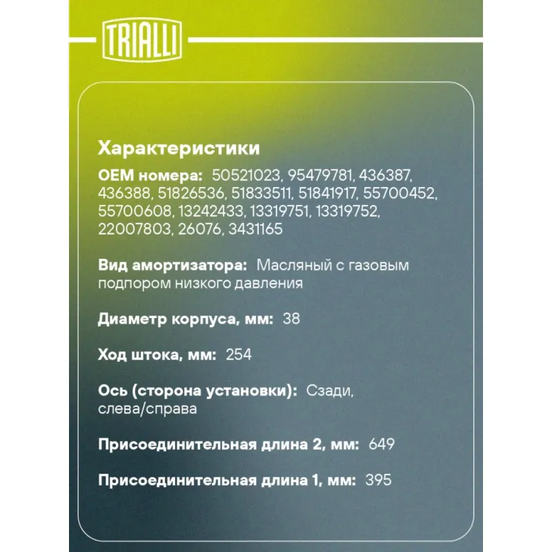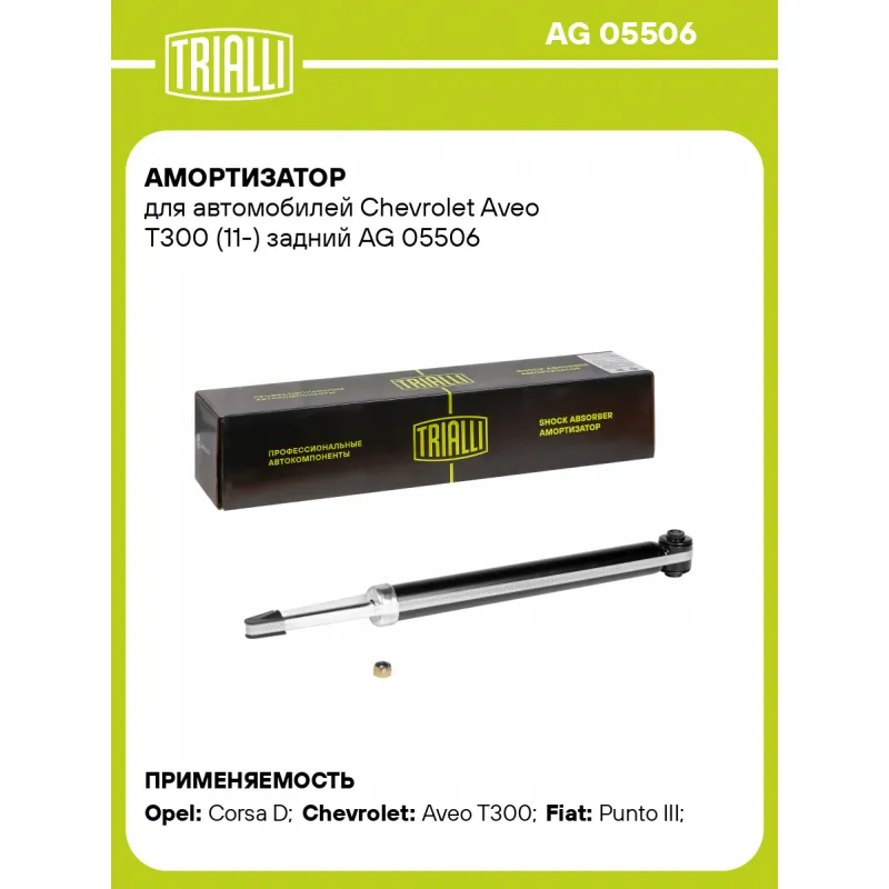 Амортизатор для автомобилей Chevrolet Aveo T300 (11-) задний Описание: Амортизатор AG 05506 бренда TRIALLI – это устройство для гашения колебаний (демпфирования) и поглощения толчков и ударов, действующих на раму. Особенности AG 05506: - Вид – Масляный с газовым подпором низкого давления; - Тип – Двухтрубный, гидравлический; Для крепления к деталям кузова или подвески используются крепления: верхнее Шток M10x1.5; и нижнее Проушина/сайлентблок. Совместим с: ABARTH GRANDE PUNTO, PUNTO, CHEVROLET AVEO, FIAT PUNTO, OPEL CORSA.Подбор по VIN-номеру вашего автомобиля - через кнопку 'Задать вопрос'. Специалист проверит применяемость и ответит вам. Преимущества: - Инновационная технология производства; - Контроль качества каждой позиции по чертежам и с помощью 3D модели; - Сальник NOK; - Высокоэффективная система проектирования; - Гарантия до двух лет или 60 000 км пробега; Амортизаторы автомобильные существенно влияют на комфорт вождения, сокращая вибрации от неровностей дороги, что делает поездку более плавной и приятной. Регулярное и своевременное обслуживание амортизаторов помогут продлить их срок службы и обеспечить надёжную работу. Характеристики: Артикул: AG 05506 OEM номера: 50521023, 95479781, 436387, 436388, 51826536, 51833511, 51841917, 55700452, 55700608, 13242433, 13319751, 13319752, 22007803, 26076, 3431165, 3431230, 3449692, 3451375, 436151, 436294, 436295, 436304, 436309, 436313, 436341, 436364, 436365, 436369, 436380, 436385, 436386, 436390, 436393, 436394, 436395, 436397, 436399, 436406, 436426, 436468, 436469, 436471, 436480, 436482, 95077490, 88963482, 8939585, 8953422, 8965567, 8977900, 90005038, 9004027, 90399490, 91018422, 93173756, 93177873, 93177874, 93177883, 93183291, 93183293, 93186892, 93187019, 93187931, 93187932, 93189035, 93189036, 93189037, 93189038, 93191023, 93191026, 97043818, 97179444, GDA1037 Товарная линейка: BLACK Количество на автомобиль: 2 Вид амортизатора: Масляный с газовым подпором низкого давления Тип верхнего крепления: Шток Тип нижнего крепления: Проушина/сайлентблок Диаметр корпуса, мм: 38 Диаметр штока, мм: 12.5 Ход штока, мм: 254 Размер резьбы штока: M10x1.5 Тип амортизатора: Двухтрубный, гидравлический Ось (сторона установки): Сзади, слева/справа Дополнительная информация: Упаковка изделия может отличаться от представленной на фото Присоединительная длина 2, мм: 649 Присоединительная длина 1, мм: 395 Сопутствующий товар: Амортизаторы: AG 05157; AG 05358 Гарантийный срок: 2 года/60 000 км Подходит для авто: Opel Corsa D (06-) Chevrolet Aveo T300 (11-) Fiat Punto III (05-) Для проверки применяемости отправьте VIN автомобиля через вкладку "Есть вопросы о товаре?" Комплектация: Амортизатор задний - 1 шт Шарнир резинометаллический - 1 шт Гайка крепежная - 1 шт Гарантия: от 1 года.