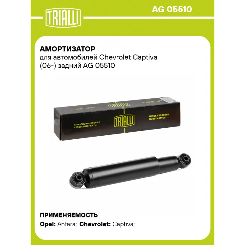 Амортизатор для автомобилей Chevrolet Captiva (06-) задний Описание: Амортизатор AG 05510 бренда TRIALLI – это устройство для гашения колебаний (демпфирования) и поглощения толчков и ударов, действующих на раму. Особенности AG 05510: - Вид – Масляный с газовым подпором низкого давления; - Тип – Двухтрубный, гидравлический; Для крепления к деталям кузова или подвески используются крепления: верхнее Проушина/сайлентблок ; и нижнее Проушина/сайлентблок. Совместим с: CHEVROLET CAPTIVA, DAEWOO WINSTORM, OPEL ANTARA.Подбор по VIN-номеру вашего автомобиля - через кнопку 'Задать вопрос'. Специалист проверит применяемость и ответит вам. Преимущества: - Инновационная технология производства; - Контроль качества каждой позиции по чертежам и с помощью 3D модели; - Сальник NOK; - Высокоэффективная система проектирования; - Гарантия до двух лет или 60 000 км пробега; Амортизаторы автомобильные существенно влияют на комфорт вождения, сокращая вибрации от неровностей дороги, что делает поездку более плавной и приятной. Регулярное и своевременное обслуживание амортизаторов помогут продлить их срок службы и обеспечить надёжную работу. Характеристики: Артикул: AG 05510 OEM номера: 20924240, 95104355, 20767213, 4804644, 4806443, 4810737, 4814244, 96809998, 96852917, 96626214, 96626215, 96626350 Товарная линейка: BLACK Количество на автомобиль: 2 Вид амортизатора: Масляный с газовым подпором низкого давления Тип верхнего крепления: Проушина/сайлентблок Тип нижнего крепления: Проушина/сайлентблок Диаметр корпуса, мм: 51 Диаметр штока, мм: 12,5 Ход штока, мм: 211 Тип амортизатора: Двухтрубный, гидравлический Ось (сторона установки): Сзади, слева/справа Дополнительная информация: Не для а/м с регулируемой задней подвеской Присоединительная длина 2, мм: 565 Присоединительная длина 1, мм: 354 Сопутствующий товар: Амортизаторы: AG 05164; AG 05365 Гарантийный срок: 2 года/60 000 км Подходит для авто: Opel Antara (06-), Antara (06-) Chevrolet Captiva (06-), Captiva (11-), Captiva (11-) Для проверки применяемости отправьте VIN автомобиля через вкладку "Есть вопросы о товаре?" Комплектация: Амортизатор задний - 1 шт Шарнир резинометаллический - 2 шт Гарантия: от 1 года.