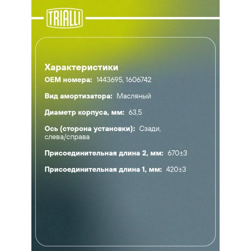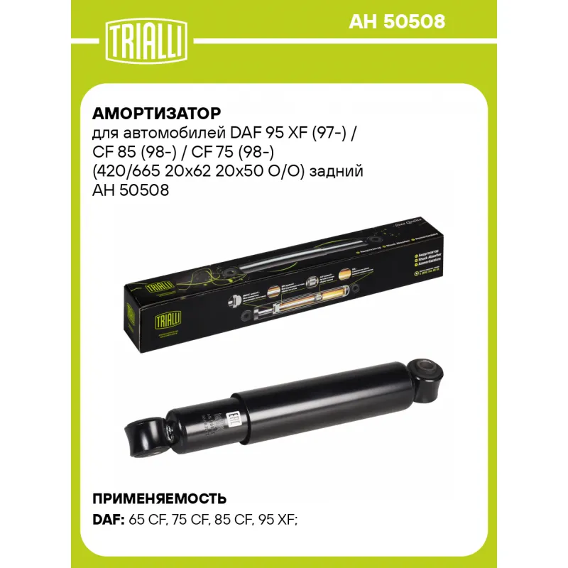 Амортизатор для автомобилей DAF 95 XF (97-) / CF 85 (98-) / CF 75 (98-) (420/665 20x62 20x50 O/O) задний Описание: Амортизатор AH 50508 бренда TRIALLI – это устройство для гашения колебаний (демпфирования) и поглощения толчков и ударов, действующих на раму. Особенности AH 50508: - Вид – Масляный; - Тип – Двухтрубный, гидравлический; Для крепления к деталям кузова или подвески используются крепления: верхнее Проушина/сайлентблок ; и нижнее Проушина/сайлентблок. Совместим с: DAF CF 65, 65, CF 75, 75, CF 85, 85, 95, XF 95, LF 55.Подбор по VIN-номеру вашего автомобиля - через кнопку 'Задать вопрос'. Специалист проверит применяемость и ответит вам. Преимущества: - Инновационная технология производства; - Контроль качества каждой позиции по чертежам и с помощью 3D модели; - Сальник NOK; - Высокоэффективная система проектирования; - Гарантия до двух лет или 60 000 км пробега; Амортизаторы автомобильные существенно влияют на комфорт вождения, сокращая вибрации от неровностей дороги, что делает поездку более плавной и приятной. Регулярное и своевременное обслуживание амортизаторов помогут продлить их срок службы и обеспечить надёжную работу. Характеристики: Артикул: AH 50508 OEM номера: 1443695, 1606742 Товарная линейка: BLACK Количество на автомобиль: 2 Вид амортизатора: Масляный Тип верхнего крепления: Проушина/сайлентблок Тип нижнего крепления: Проушина/сайлентблок Диаметр корпуса, мм: 63.5 Диаметр штока, мм: 20 Тип амортизатора: Двухтрубный, гидравлический Ось (сторона установки): Сзади, слева/справа Присоединительная длина 2, мм: 670±3 Присоединительная длина 1, мм: 420±3 Сопутствующий товар: Амортизаторы: AH 50505 Гарантийный срок: 2 года/60 000 км Подходит для авто: DAF 65 CF (98-), 75 CF (95-), 85 CF (95-), 95 XF (97-) Для проверки применяемости отправьте VIN автомобиля через вкладку "Есть вопросы о товаре?" Комплектация: Амортизатор задний - 1 шт Шарнир резинометаллический - 2 шт Гарантия: от 1 года.